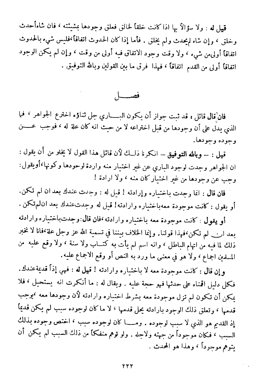 وإن قال: كانت موجودة معه لا باختياره وإرادته! قيل له: فهي إذا قديمة عندك. فكل دليل أقمناه على حدثها فهو حجة عليه. ويقال له: ما أنكرت أنه يستحيل، فلا يمكن أن تكون لم تزل موجودة معه بشرط اختياره وإرادته لأن وجوده معه، يوجب قدمها، وتعلق ذلك الوجود بإرادته يحل قدمها، لا ما كان لوجوده سبب لم يكن قديما إذ القديم هو الذي لا سبب لوجوده. وما كان لوجوده سبب، اختص وجوده بذلك السبب، فكان موجودا من جهته ولأجله. ولو توهم منفكا من ذلك السبب لم يكن أن يتوهم موجودا، وهذا هو المحدث.