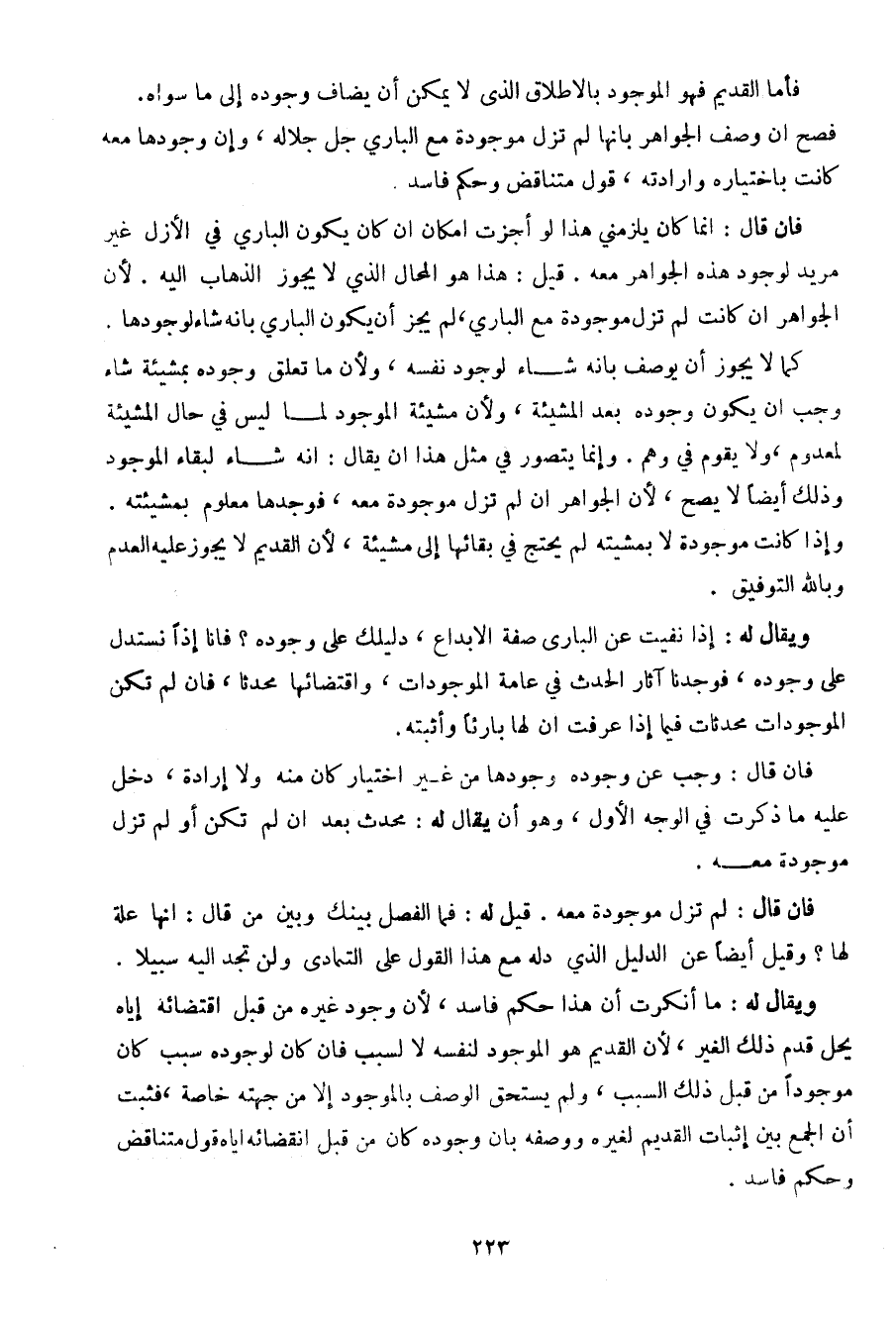 فإن قال: إنما كان يلزمني هذا لو أجزت إمكان إن كان يكون الباري في الأزل غير مريد لوجود هذه الجواهر معه. قيل: هذا هو الحال الذي لا يجوز الذهاب إليه. لأن الجواهر أن كانت لم تزل موجودة مع الباري، لم يجز أن يكون الباري بأنه شاء لوجودها.
