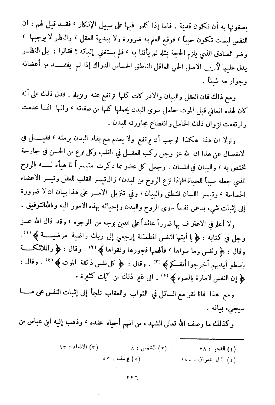 ولا أعلم في الاعتراف بها ضررا عائدا على الدين بوجه من الوجوه، وقد قال الله عز وجل في كتابه: {يا أيتها النفس المطمئنة ارجعي إلى ربك راضية مرضية}.وقال: {ونفس وما سواها، فألهمها فجورها وتقواها}. وقال: {والملائكة باسطو أيديهم أخرجوا أنفسكم}. وقال: {كل نفس ذائقة الموت}. وقال: {إن النفس لأمارة بالسوء}. إلى غير ذلك من آيات كثيرة.