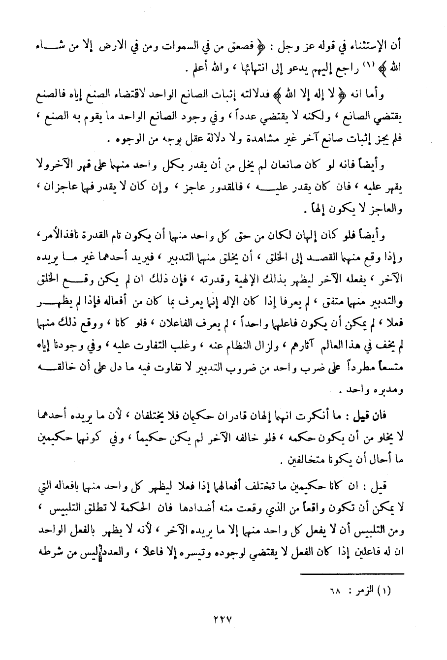 قيل: إن كانا حكيمين ما تختلف أفعالهما إذا فعلا ليظهر كل واحد منهما بأفعاله التي لا يمكن أن تكون واقعا من الذي وقعت منه أضدادها فإن الحكمة لا تطلق التلبيس، ومن التلبيس أن لا يفعل كل واحد منهما إلا ما يريده الآخر، لأنه لا يظهر بالفعل الواحد أن له فاعلين إذا كان الفعل لا يقتضي لوجوده وتيسره إلا فاعلا، والعدد ليس من شرطه