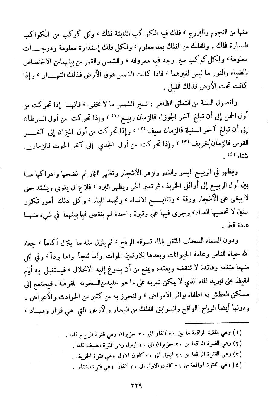 ويظهر في الربيع اليسر والنمو وتزهر الأشجار وتظهر الثمار ثم نضجها وإدراكها ما بين أول الربيع إلى أوائل الخريف ثم تعبر الحر ويظهر البرد، فلا يزال يقوى ويشتد حتى لا يبقى على الأشجار ورقة، وتتابع الأنداء، وتجمد المياه، وكل ذلك أمور تكرر سنين لا تحصيها العبد، وجرى فيها على وتيرة واحدة لم ينقص فيما بينهما في شيء منها عادة قط.
