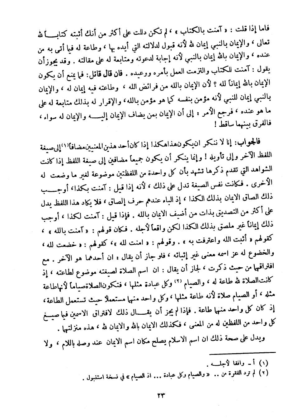 فالجواب: إنا لا ننكر أن يكون هذا هكذا إذا كان أحد هذين المعنيين مضافا إلى صيغة اللفظ الآخر وإلى تأويله! وإنما ينكر أن يكون جميعا مضافين إلى صيغة اللفظ إذا كانت الشواهد التي تقدم ذكرها تشهد بأن كل واحدة من اللفظتين موضوعة لغير ما وضعت له الأخرى. فكانت نفس الصيغة تدل على ذلك، لأنه إذا قيل: آمنت بكذا، أوجب ذلك إلصاق الإيمان بذلك الكذا، إذ الباء عندهم حرف إلصاق، فلا يكاد هذا اللفظ يدل على أكثر من التصديق بذات من أضيف الإيمان بالله. فإذا قيل: آمنت لكذا، أوجب ذلك إيمانا غير ملصق بذلك الكذا لكن واقعا لأجله. فكان قولهم: "آمنت بالله"، كقولهم "أثبت الله واعترفت به". وقولهم: "آمنت لله"، كقولهم: "خضعت لله، والخضوع له عز اسمه معنى غير إثباته، فلو جاز أن يقال: أن أحدهما هو الآخر. مع افتراقهما من حيث ذكرت، لجاز أن يقال: أن اسم الصلاة لصيغته موضوع لطاعته، إذ كانت الصلاة لله طاعة له، والصيام وكل عبادة مثلها، فتكون الصلاة صياما لأنها طاعة مثله، أو الصيام صلاة لأنه طاعة مثلها، وكل واحد منهما مستعملا حيث تستعمل الطاعة، إذ كان كل واحد منهما طاعة. فإذا لم يجز أن يقال ذلك لافتراق الاسمين فيما صيغ كل واحد من اللفظين له من المعنى، فكذلك الإيمان بالله والإيمان لله، هذه منزلتهما.