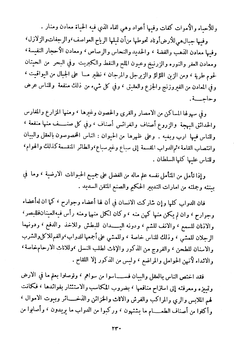 فقد اختص الناس بالعقل والبيان فساسوا من سواهم، وتوصلوا بعلم ما في الأرض وتمييزه ومعرفته إلى استنزاح منافعها، بضروب المكاسب والاستئثار بفوائدها، فكانت لهم الملابس والري والمراكب والفرش والأثاث والخزائن والذخائر وبيوت الأموال، وأكلوا من أصناف الطعام ما يشتهون، وركبوا من الدواب ما يريدون، وأصابوا من