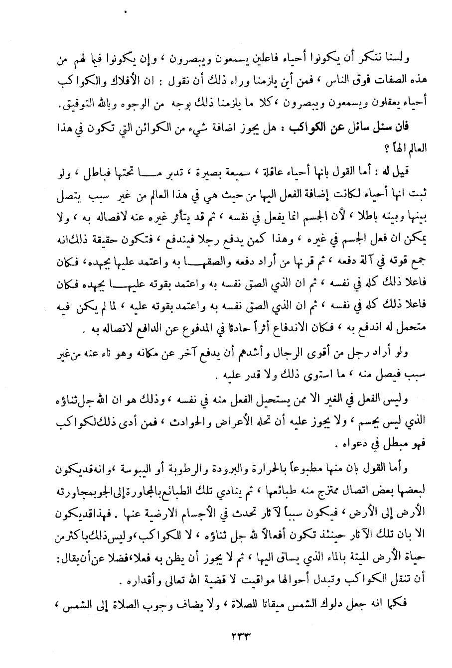 وأما القول بأن منها مطبوعا بالحرارة والبرودة والرطوبة أو اليبوسة، وأنه قد يكون لبعضها بعض اتصال ممتزج منه طبائعها، ثم ينادي تلك الطبائع بالمجاورة إلى الجو بمجاورته الأرض إلى الأرض، فيكون سببا لآثار تحدث في الأجسام الأرضية عنها. ف ذا قد يكون إلا بان تلك الآثار حينئذ تكون أفعالا لله جل ثناؤه، لا للكواكب، وليس ذلك بأكثر من حياة الأرض الميتة بالماء الذي يساق إليه، ثم لا يجوز أن يظن به فعلا، فضلا عن أن يقال: أن تنقل الكواكب وتبدل أحوالها مواقيت لا قضية الله تعالى وأقداره.