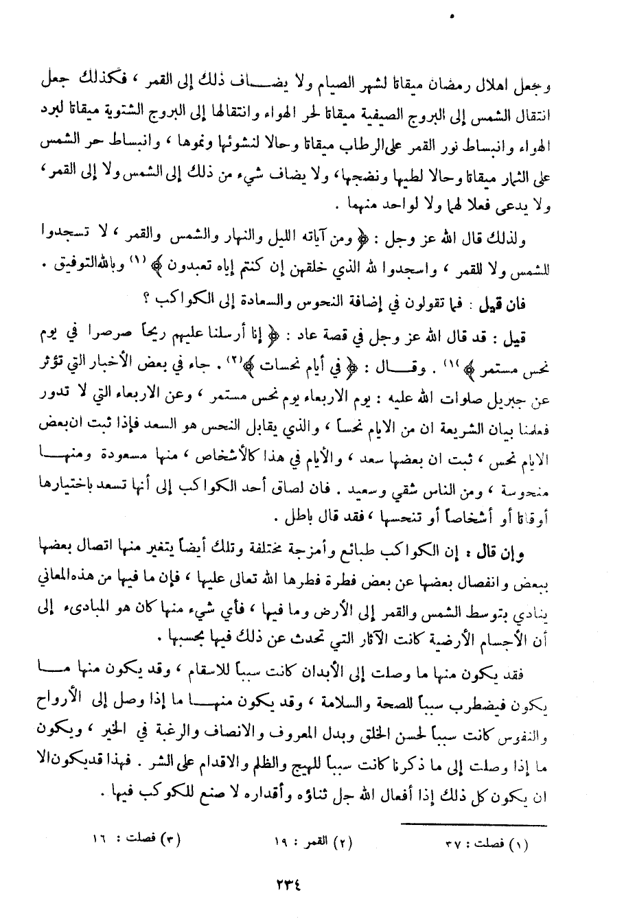 فقد يكون منها ما وصلت إلى الأبدان كانت سببا للأسقام، وقد يكون منها ما يكون فيضرب سببا للصحة والسلامة، وقد يكون منها ما إذا وصل إلى الأرواح والنفوس كانت سببا لحسن الخلق وبدل المعروف والأنصاف والرغبة في الخير، ويكون ما إذا وصلت إلى ما ذكرنا كانت سببا للهيج والظلام والأقدام على الشر. فهذا قد يكون إلا أن يكون كل ذل إذا أفعال الله جل ثناؤه وأقداره لا صنع للكوكب فيها.