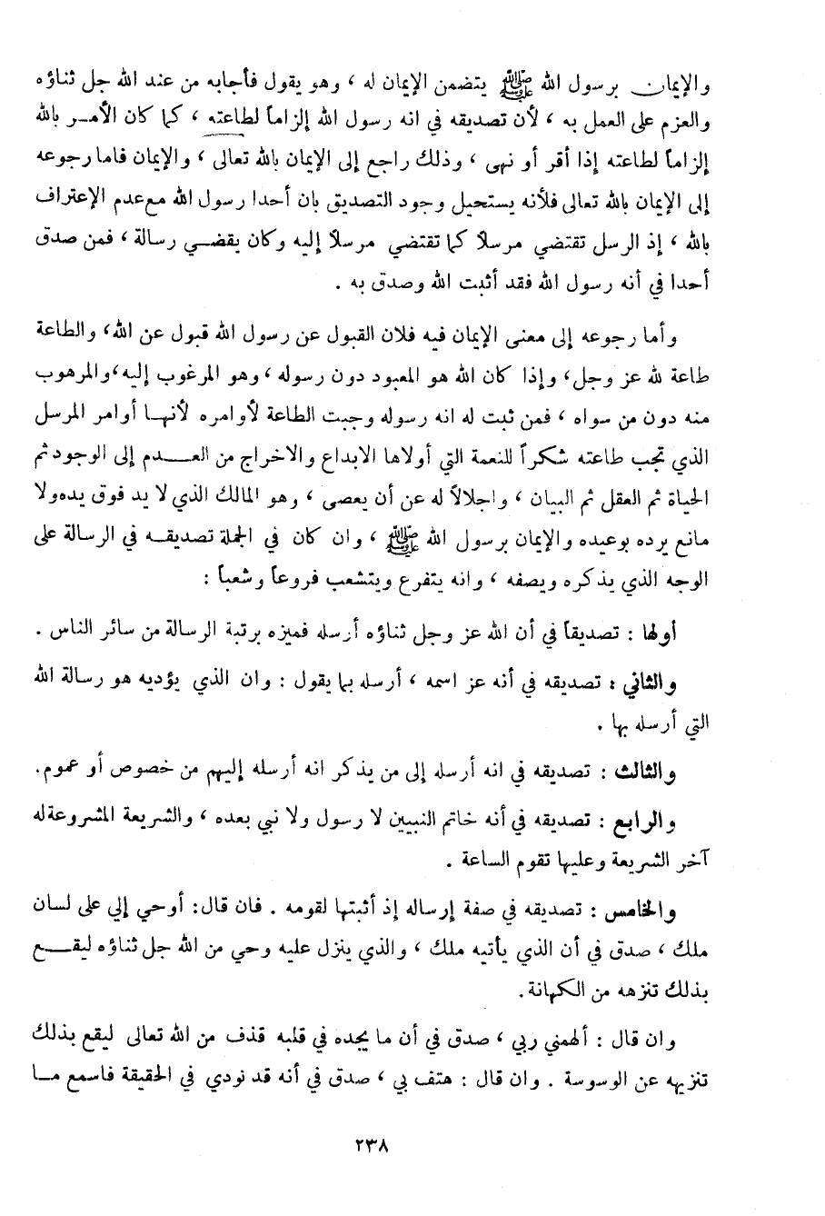 وأما رجوعه إلى معنى الإيمان فيه فلان القبول عن رسول الله قبول عن الله، والطاعة طاعة الله عز وجل، وإذا كان الله هو المعبود دون رسوله، وهو المرغوب إليه، والمرهوب منه دونه من سواه، فمن ثبت له أنه رسوله وجبت الطاعة لأوامره لأنها أوامر المرسل الذي جب طاعته شكرا للنعمة التي أولاها الإبداع والإخراج من العدم إلى الوجود ثم الحياة ثم العقل ثم البيان، وإجلالا له عن أن يعصى، وهو المالك الذي لا يد فوق يده ولا مانع يرده بوعيده والإيمان برسول الله صلى الله عليه وسلم، وإن كان في الجملة تصديقه في الرسالة على الوجه الذي يذكره ويصفه، وأنه يتفرع ويتشعب فروعا وشعبا: