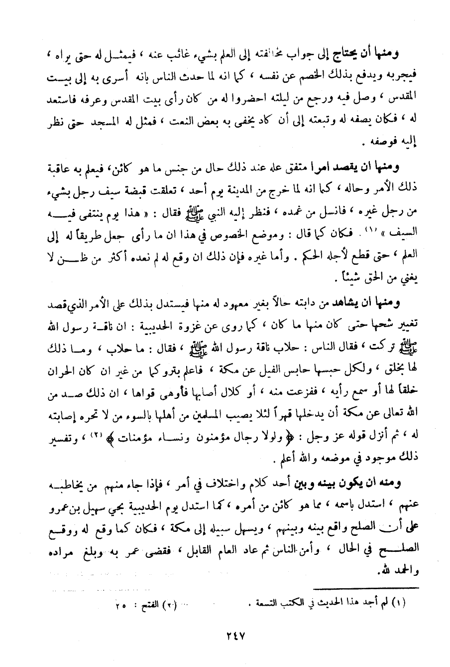 ومنها أن يقصد أمرا متفق عله عند ذلك حال من جنس ما هو كائن، فيعلم به عاقبة ذلك الأمر وحاله، كما أنه لما خرج من المدينة أحد، تعلقت قبضة سيف رجل بشيء من رجل غيره، فانسل من غمده، فنظر إليه النبي صلى الله عليه وسلم فقال: "هذا يوم ينتفى فيه السيف". فكان كما قال: وموضع الخصوص في هذا أن ما رأى جعل طريقا له إلى العلم، حتى قطع لأجله الحكم. وأما غيره فإن ذلك أن وقع له لم نعده أكثر من ظن لا يغني من الحق شيئا.