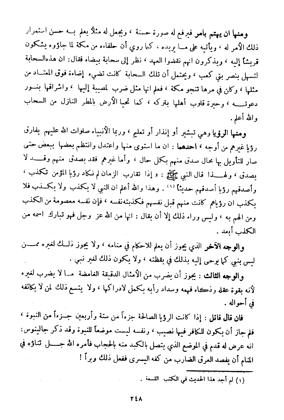 ومنها الرؤية وهي تبشير أو إنذار أو تعليم، وربما الأنبياء صلوات الله عليهم يفارق رؤيا غيرهم من أوجه، أحدهما: أن ما استوي منها واعتدل وانتظم بعضها ببعض حتى صار للتأويل بحا محال صدق منهم بكل حال، وأما غيرهم فقد يصدق منهم وقد لا يصدق، ولهذا قال النبي صلى الله عليه وسلم: "إذا تقارب الزمان لم نكاد رؤيا المؤمن تكذب، وأصدقهم رؤيا أصدقهم حديثا. وهذا والله أعلم أن النبي لا يكذب ولا يكذب فلا يكذب أن رؤياهم كانت منهم قبل نفسهم فكذبته نفسه، فإن نفسه معصومة من الكذب ومن الهم به، وليس وراء ذلك إلا أن يقال: أنها من الله عز وجل فهو تبارك اسمه من الكذب أبعد.