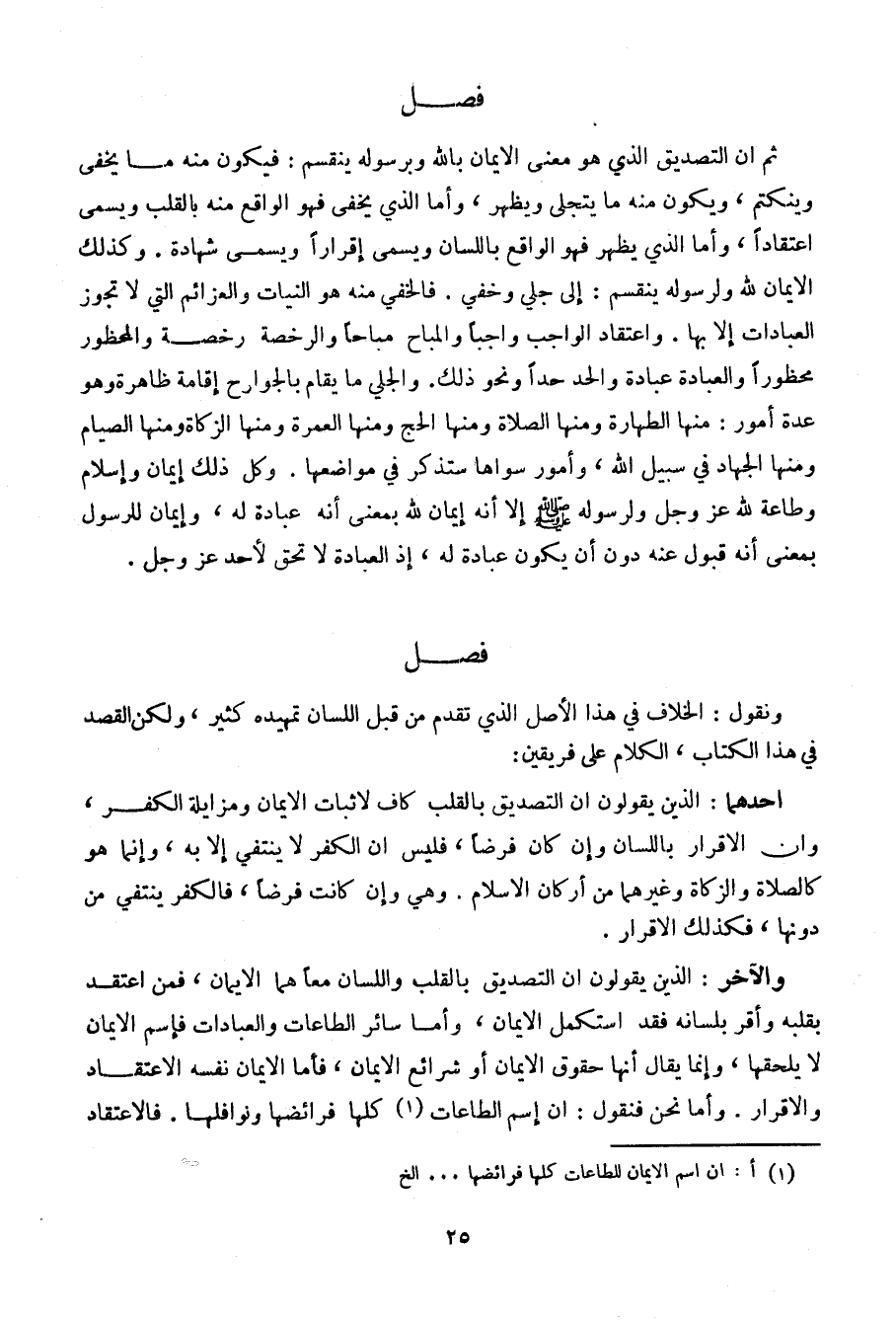 ثم أن التصديق الذي هو معنى الإيمان بالله وبرسوله ينقسم: فيكون منه ما يخفى وينكتم، ويكون منه ما يتجلى ويظهر، وأما الذي يخفى فهو الواقع منه بالقلب ويسمى اعتقادا، وأما الذي يظهر فهو الواقع باللسان ويسمى إقرارا ويسمى شهادة. وكذلك الإيمان لله ولرسوله ينقسم: إلى جلي وخفي. فالخفي منه هو النيات والعزائم التي لا تجوز العبادات إلا بها. واعتقاد الواجب واجبا والمباح مباحا والرخصة رخصة والمحظور محظورا والعبادة عبادة والحد حدا ونحو ذلك. والجلي ما يقام بالجوارح إقامة ظاهرة وهو عدة أمور: منها الطهارة ومنها الصلاة ومنها الحج ومنها العمرة ومنها الزكاة ومنها الصيام ومنها الجهاد في سبيل الله، وأمور سواها ستذكر في مواضعها. وكل ذلك إيمان وإسلام وطاعة لله عز وجل ولرسوله صلى الله عليه وسلم إلا أنه إيمان لله بمعنى أنه عبادة له، وإيمان للرسول بمعنى أنه قبول عنه دون أن يكون عبادة له، إذ العبادة لا تحق لأحد عز وجل.