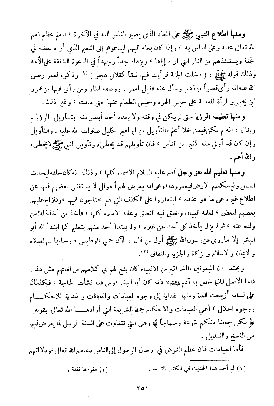 ويحتمل أن المبعوثين بالشرائع من الأنبياء كان يقع لهم في كلامهم من لغاتهم مثل هذا. فأما الأصل فإنما خص به آدم عليه السلام لأنه كان أبا البشر، ومن فيه نشأت الحاجة، فكذلك على لسنه أزيحت العلة ومنها الهداية إلى وجوه العبادات والديانات والهداية للأحكام ووجوه الحلال، أعني العبادات والأحكام جملة الشريعة التي أرادها الله تعالى بقوله: {لكل جعلنا منكم شرعة ومنهاجاً {وهي التي تتفاوت على السنة الرسل لما يعرض فيها من النسخ والتبديل.