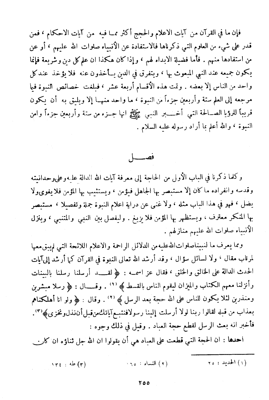 ومما يعرف ما لنبينا صلوات الله عليه من الدلائل الراحمة والأعلام اللائحة التي لم يبق معها لمرتاب مقال، لا لسائل سؤال، وقد أرشد الله تعالى النبوة في القرآن كما أرشد إلى آيات الحدث الدالة على الخالق والخلق، فقال عز اسمه: {لقد أرسلنا رسلنا بالبينات وأنزلنا معهم الكتاب والميزان ليقوم الناس بالقسط {. قال: {رسلا مبشرين ومنذرين لئلا يكون للناس على الله حجة بعد الرسل {. وقال: {ولو أنا أهلكناهم بعذاب من قبله لقالوا ربنا لولا أرسلت إلينا رسولا فنتبع آياتك من قبل أن نذل ونخزى {. فأخبر انه بعث الرسل لقطع حجة العباد. وقيل في ذلك وجوه: