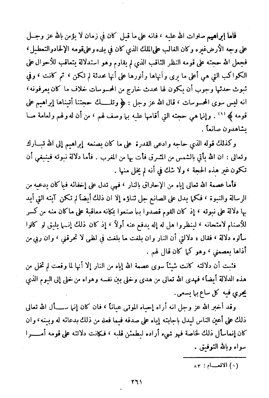 فأما إبراهيم صلوات الله عليه، فإنه على ما قيل كان في زمان لا يؤمن بالله عز وجل على وجه الأرض غيره وكان الغالب على الملك الذي كان في بلده وعلى قومه بالإلحاد والتعطيل، فجعل الله حجته على قومه النظر الثاقب الذي لم يقاوم وهو استدلالة يتعاقب للأحوال على الكواكب التي هي أعلى ما يرى وأنهاها وأنورها على أنها محدثة لم تكن، ثم كانت، وفي ثبوت حدثها وجوب أن يكون لها محدث خارج من المحسوسات خلاف ما كان يعرفونه، أنه ليس سوى المحسوسات، قال الله عز وجل {وتلك حجتنا أتيناها إبراهيم على قومه {. وإنما هي حجته التي أقامها عليه بها وصف لهم، من أن له ولهم ولعامة ما يشاهدون صانعاً.