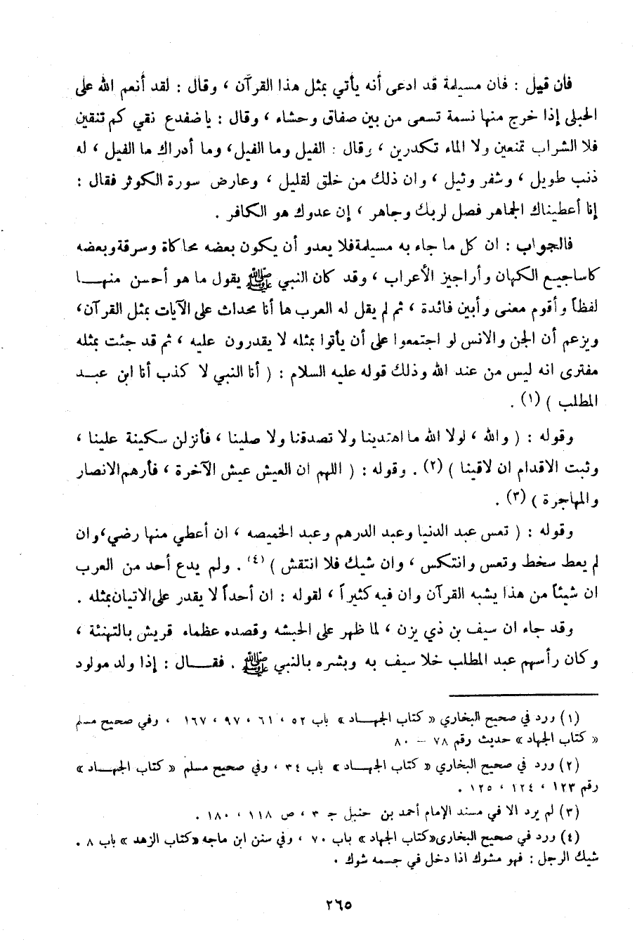 فالجواب: إن كل ما جاء به مسيلمة فلا يعدو أن يكون بعضه محاكاة وسرقة وبعضه كأساجيع الكهان وأراجيز الأعراب، وقد كان النبي صلى الله عليه وسلم يقول ما هو أحسن منها لفظاً وأقوم معنى وأبين فائدة، ثم لم يقل له العرب ها أنا محداث على الآثات بمثل القرآن، ويزعم أن الجن والإنس لو اجتمعوا على أن يأتوا بمثله لا يقدرون عليه، ثم قد جئت بمثله مفترى أنه ليس من عند الله وذلك قوله عليه السلام: (أنا النبي لا كذب أنا ابن عبد المطلب).