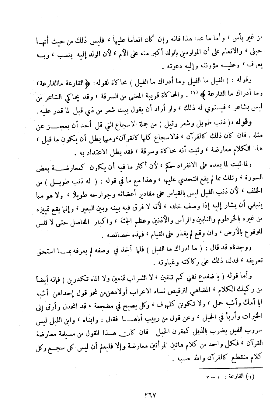 وأما قوله: (يا ضفدع نقي كم تنقين، لا الشراب تمنعين ولا الماء تدركين) فإنه أيضا من ركيك الكلام، المضاهي لترقيص نساء الأعراب وأولادهن من نحو قول إحداهن أشبه أيا أمك وأشبه حمل، ولا تكونن كلهوف، كل يصيح في مضجعة، قد انحدل وأرق إلى الخيرات وأربأ في الحيل، وعنه هقول من ربيب أباها فقال: وابناه، وابن لليل ليس سروب الفيل يضرب بالذيل كمقرن الحبل فإن كان هذا القول من مسيلمة معارضة القرآن، فكل واحد من كلام هاتين المرأتين معارضة وإلا فليعلم أن ليس كل سجع وكل كلام منقطع كالقرآن والله حسبه.