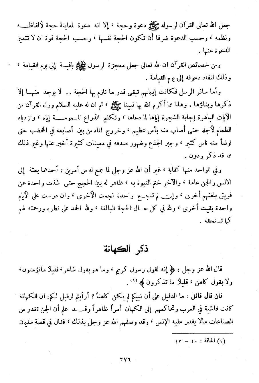 فإن قال قائل: ما الدليل على أن نبيكم لم يكن كاهنا؟ أرأيتم لو قيل لكم: أن الكهانة كانت فاشية في العرب وتحاكمهم إلى ظاهرا وقد علم ان الجن تقدر من الصناعات ما لا يقدر عليه الإنس، وقد وصفهم الله عز وجل بذلك، فقال في قصة سليمان