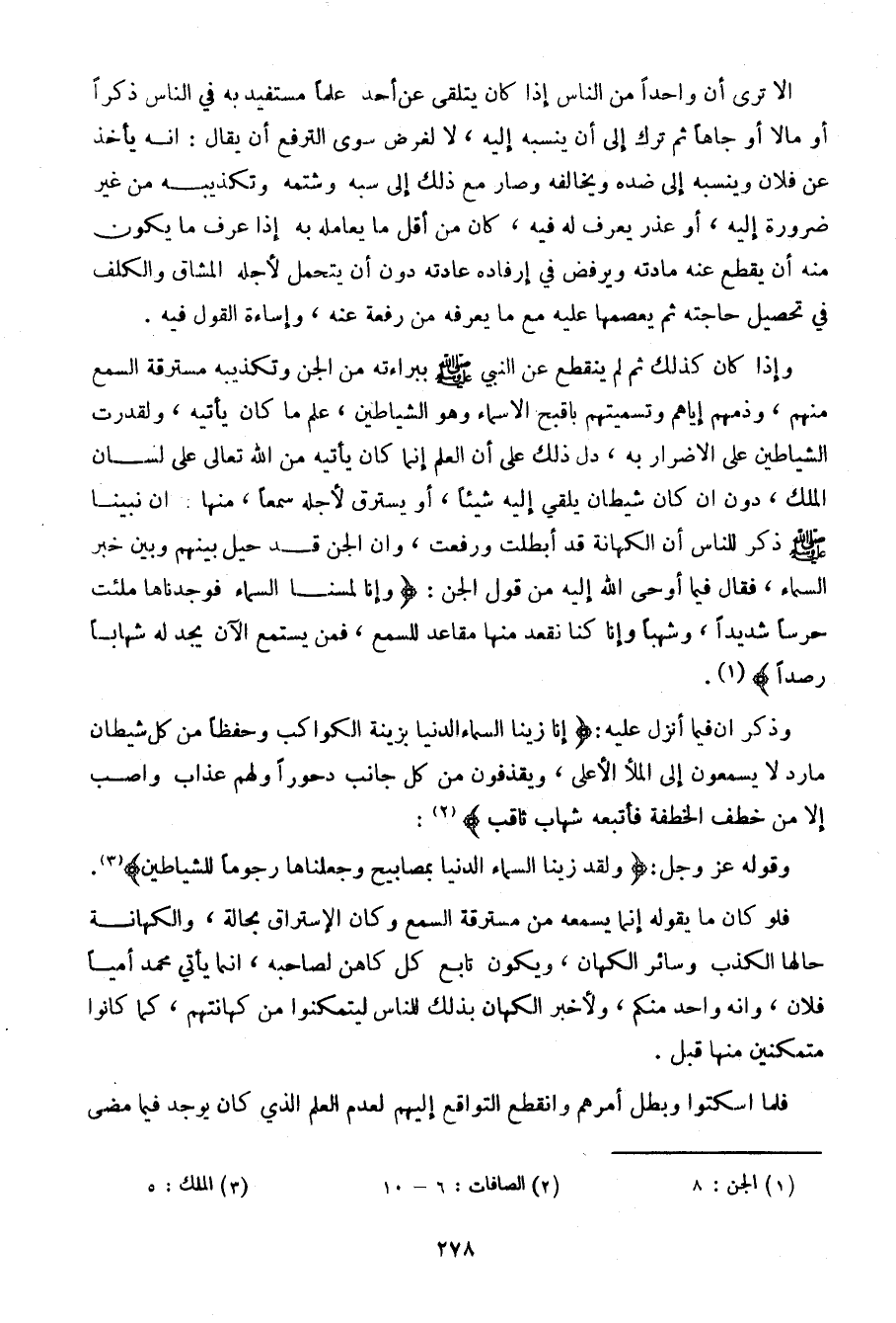 وإذا كان كذلك ثم لم ينقطع عن النبي صلى الله عليه وسلم ببراءته من الجن وتكذيبه مسترقة السمع منهم، وذمهم إياهم وتسميتهم بأقبح الأسماء وهو الشياطين، علم ما كان يأتيه، ولقدرت الشياطين على الإضرار به، دل ذلك على أن العلم إنما كان يأتيه من الله تعالى على لسان الملك، دون إن كان شيطان يلقي إليه شيئا، أو يسترق لأجله سمعا، منها: أن نبينا صلى الله عليه وسلم ذكر للناس أن الكهانة قد أبطلت ورفعت، وأن الجن قد حيل بينهم وبين خبر السماء، فقال فيما أوحى الله إليه من قول الجن: {وإنا لمنا السماء فوجدناها ملئت حرساً شديداً، وشهباً وإنا كنا نقعد منها مقاعد للسمع، فمن يستمع الآن يجد له شهاباً رصداً}