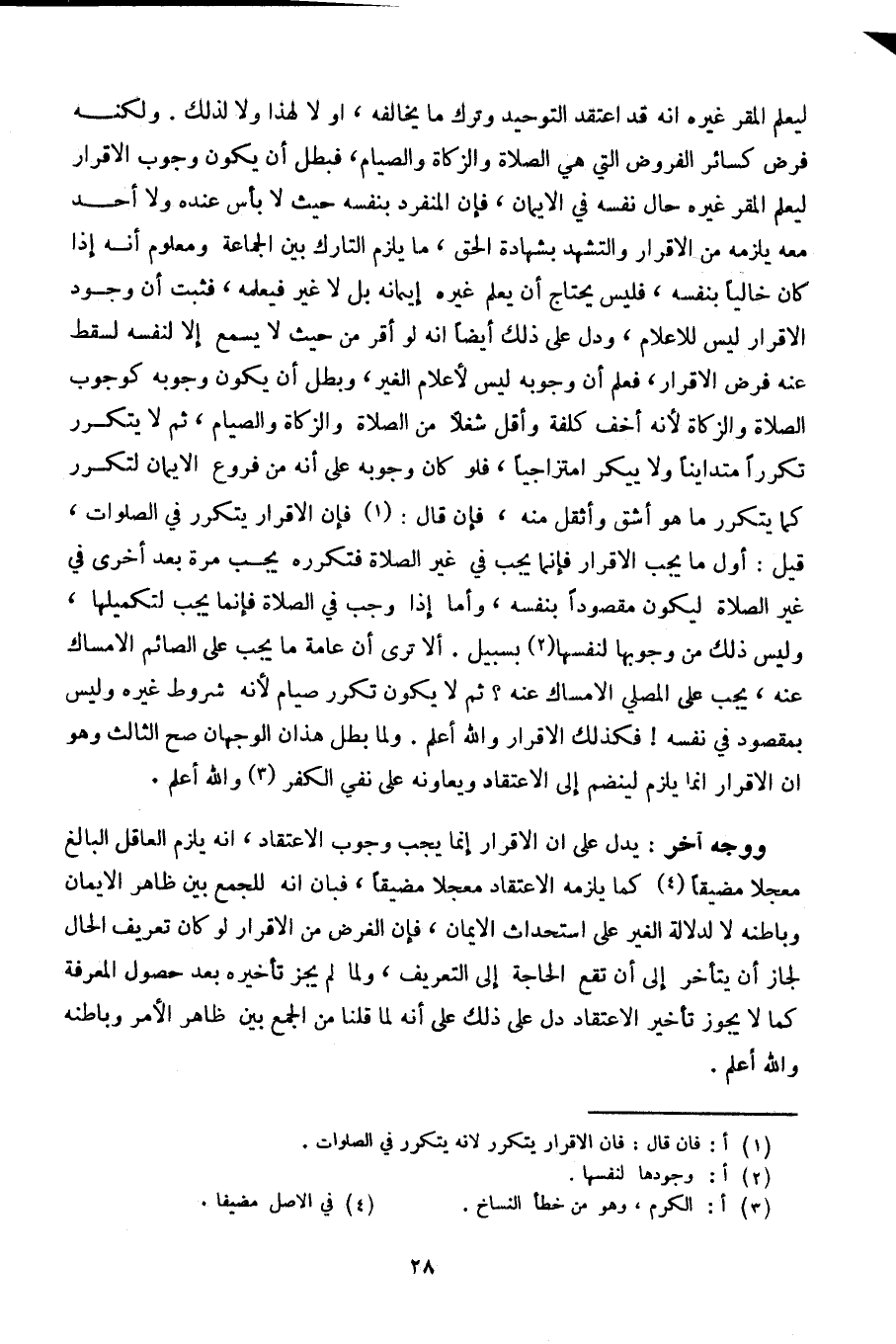 ليعلم المقر غيره أنه قد اعتقد التوحيد وترك ما يخالفه، أو لا لهذا ولا لذلك. ولكنه فرض كسائر الفروض التي هي الصلاة والزكاة والصيام، فبطل أن يكون وجوب الإقرار ليعلم المقر غيره حال نفسه من الإيمان، فإن المنفرد بنفسه حيث لا بأس عنده ولا أحد معه يلزمه من الإقرار والتشهد بشهادة الحق، ما يلزم التارك بين الجماعة ومعلوم أنه إذا كان خاليا بنفسه، فليس يحتاج أن يعلم غيره إيمانه بل لا غير فيعلمه، فثبت أن وجود الإقرار ليس للإعلام، ودل على ذلك أيضا أنه لو أقر من حيث لا يسمع إلا لنفسه لسقط عنه فرض الإقرار، فعلم أن وجوبه ليس لأعلام الغير، وبطل أن يكون وجوبه كوجوب الصلاة والزكاة لأنه أخف كلفة وأقل شغلا من الصلاة والزكاة والصيام، ثم لا يتكرر تكرارا متداينا ولا ييكر امتزاجيا، فلو كان وجوبه على أنه من فروع الإيمان لتكرر كما يتكرر ما هو أشق وأثقل منه، فإن قال: فإن الإقرار يتكرر في الصلوات، قيل: أول ما يجب الإقرار فإنما يجب في غير الصلاة فتكرره يجب مرة بعد أخرى في غير الصلاة ليكون مقصودا بنفسه، وأما إذا وجب في الصلاة فإنما يجب لتكميلها، وليس ذلك من وجوبها لنفسها بسبيل. ألا ترى أن عامة ما يجب على الصائم الإمساك عنه، يجب على المصلي الإمساك عنه؟ ثم لا يكون تكرر صيام لأنه مشروط غيره وليس بمقصود في نفسه! فكذلك الإقرار والله أعلم. ولما بطل هذان الوجهان صح الثالث وهو أن الإقرار إنما يلزم لينضم إلى الاعتقاد ويعاونه على نفي الكفر والله أعلم.
