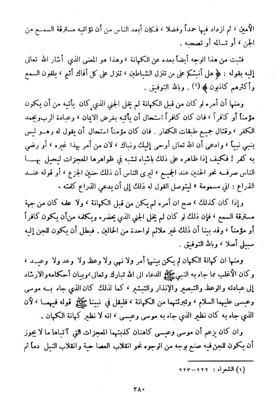 ومنها أن أمره لو كان من قبل الكهانة لم يخل الجني الذي كان يأتيه من أن يكون مؤمنا أو كافرا، فإن كان كافراً استحال أن يأتيه بغرض الإيمان، وعبادة الرب ويحمد الكفر، وقتال جميع طبقات الكفار. فإن كان مؤمنا استحال أن يقول له وهو ليس بنبي نبياً، وادعى أن الله تعالى أوحى إليك ونباك، لأن من أمر بهذا غيره، أو رضي به كفر! فكيف إذا ظاهره على ذلك بأشياء تشبه في ظواهرها المعجزات ليحيل بها الناس سرفه نحو الحنين عند الجميع، ليرى الناس أن ذلك حنين الجزع، أو قوله عند الذراع: أني مسمومة، ليتوصل القول له ذلك إلى أن يدعي الذراع كلمته.
