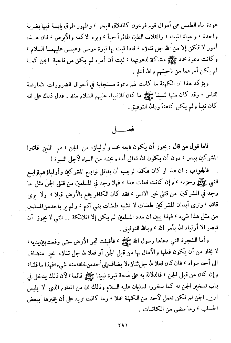 فالجواب: أن هذا لو كان هكذا لوجب ان يقاتل توابع المشركين وأولياؤهم توابع النبي صلى الله عليه وسلم وحزبه، وإن كانت فعلت هذا، فهلا وجد في المسلمين من قتلى الجنه مثل ما وجد في المشركين من قتلى غير الإنس، فقد كانه الكافر يقع بالأرض قبلا، ولا يرى قاتله، وترى أبدان المشركين طعنات لا تشبه طعنات بني آدم، ولم ير بأحد من المسلمين من مثل هذا شيء، فهذا يبين ان مدد المسلمين لم يكن إلا الملائكة .. التي لا يجوز أن تبصر إلا أولياء الله بأمر الله، وبالله التوفيق.