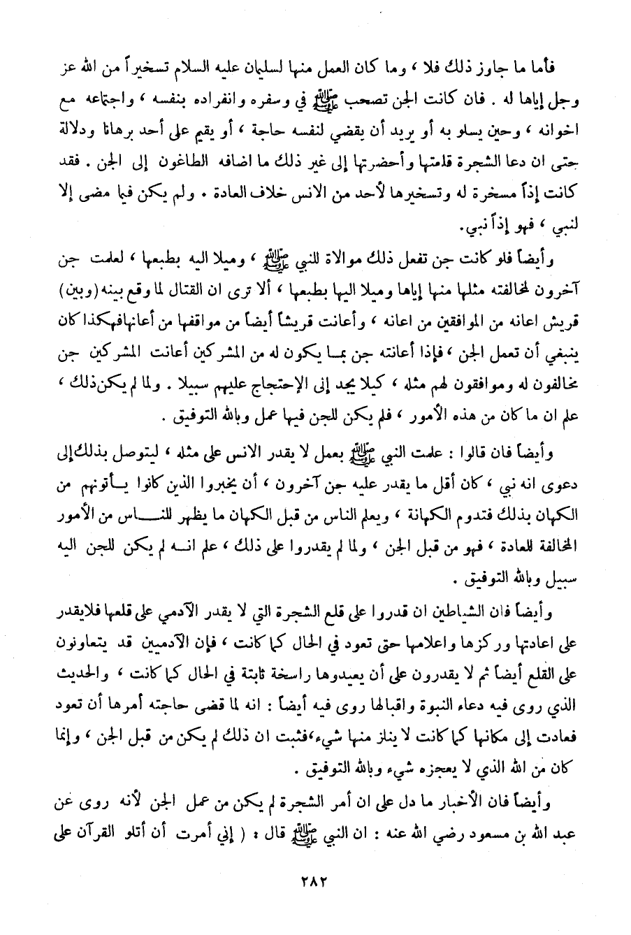 فأما ما جاوز ذلك فلا، وما كان العمل منها لسليمان عليه السلام تسخيراً من الله عز وجل إياها له. فإن كانت الجن تصحب صلى الله عليه وسلم في وسفره وانفراده بنفسه، واجتماعه مع إخوانه، وحين يساو به أو يرد أن يقضي لنفسه حاجة، أو يقي على أحد برهانا ودلالة جتى أن دعا الشجرة قامتها وأحضرتها إلى غير ذلك ما أضافه الطاغون إلى الجن. فقد كانت إذا مسخرة له وتسخيرها لأحد من الإنس خلاف العادة. ولم يكن فيما مضى إلا لنبي، فهو إذاً نبي.