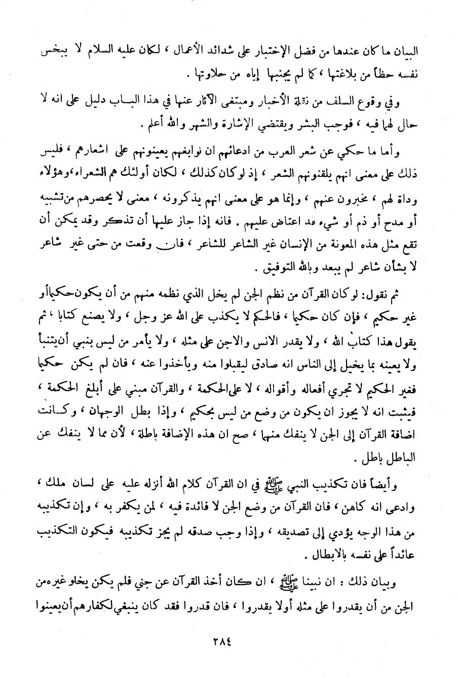 ثم نقول: لو كان القرآن من نظم الجن لم يخل الذي نظمه منهم من أن يكون حكيما أو غير حكم، فإن كان حكيما، فالحكم لا يكذب على الله عز وجل، ولا يصنع كتابا، ثم يقول هذا كتاب الله، ولا يقدر الإنس والجن على مثله، ولا يأمر من ليس بنبي أن يتنبأ ولا يعينه بما يخيل إلى الناس أنه صادق ليقبلوا منه ويأخذوا عنه، فإن لم يكن حكيما فغير الحكيم لا تجري أفعاله وأقواله، لا على الحكمة، والقرآن مبني على أبلغ الحكمة، فيثبت أنه لا يجوز أن يكون من وضع من ليس بحكيم، وإذا بطل الوجهان، وكانت إضافة القرآن إلى الجن لا ينفك منهما، صح أن هذه الإضافة باطلة، لأن مما لا ينفك عنه الباطل باطل.