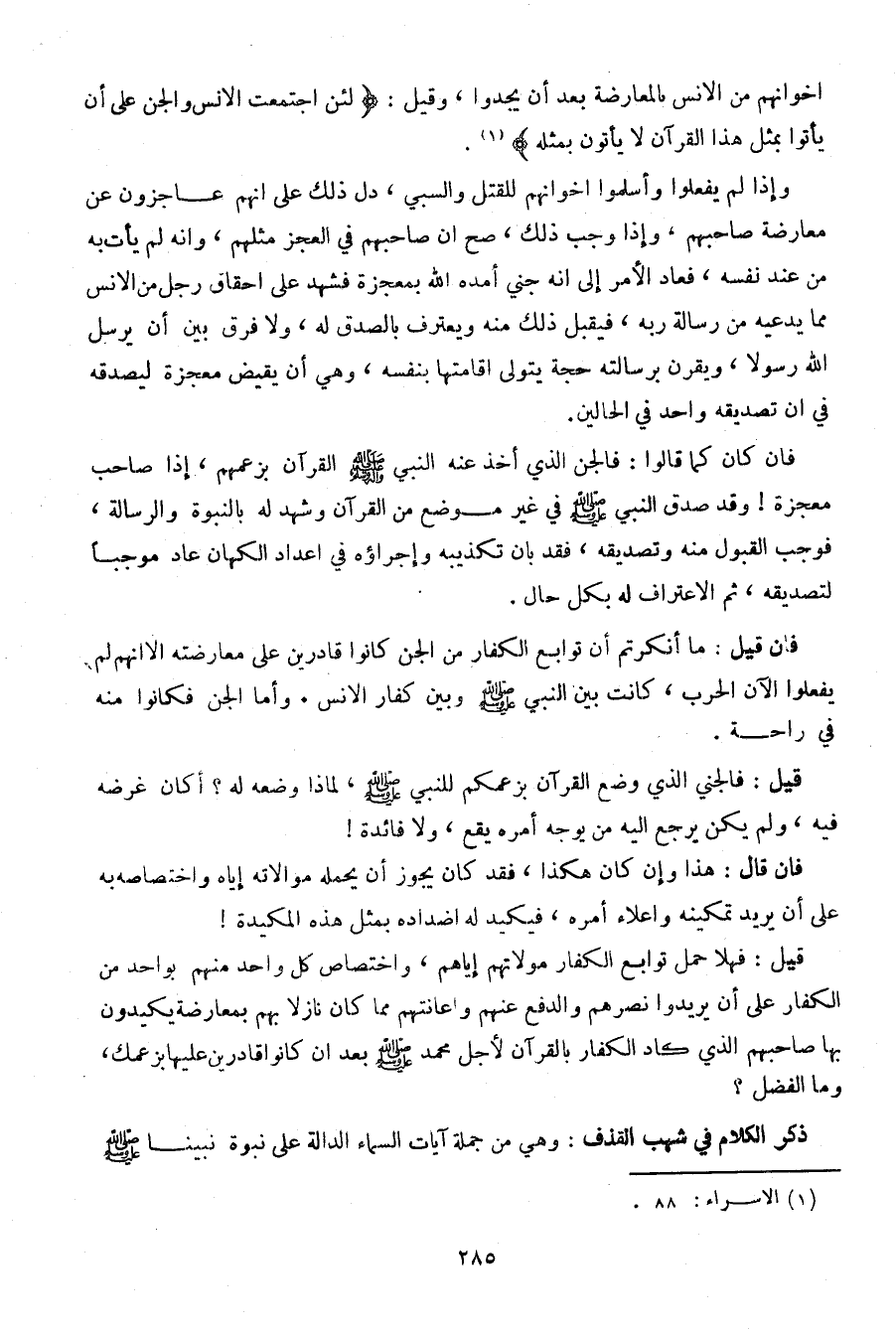 وإذا لم يفعلوا وأسلموا اخوانهم للقتل والسبي، دل ذلك على أنهم عاجزون عن معارضة صاحبهم، وإذا وجب ذلك، صح أن صاحبهم في العجز مثلهم، وإنه لم يأت به من عند نفسه، فعاد الأمر إلى أنه جني أمده الله بمعجزة فشهد على احقاق رجل من الإنس مما يدعيه من رسالة ربه، فيقبل ذلك منه ويعترف بالصدق له، ولا فرق بين أن يرسل الله رسولا، ويقرن برسالته حجة يتولى اقامتها بنفسه، وهي أن يقيض معجزة ليصدقه في أن تصديقه واحد في الحالين.