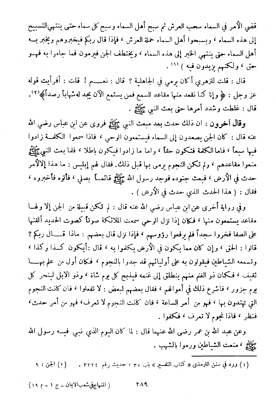 قال: قلت للزهري أكان يرمي في الجاهلية؟ قال: نعم! قلت: أفرأيت قوله عز وجل: {وإنا كنا نقعد منها مقاعد السمع فمن يستمع الآن يجد له شهاباً رصداً} قال: غلطت وشدد أمرها حق بعث النبي صلى الله عليه وسلم.