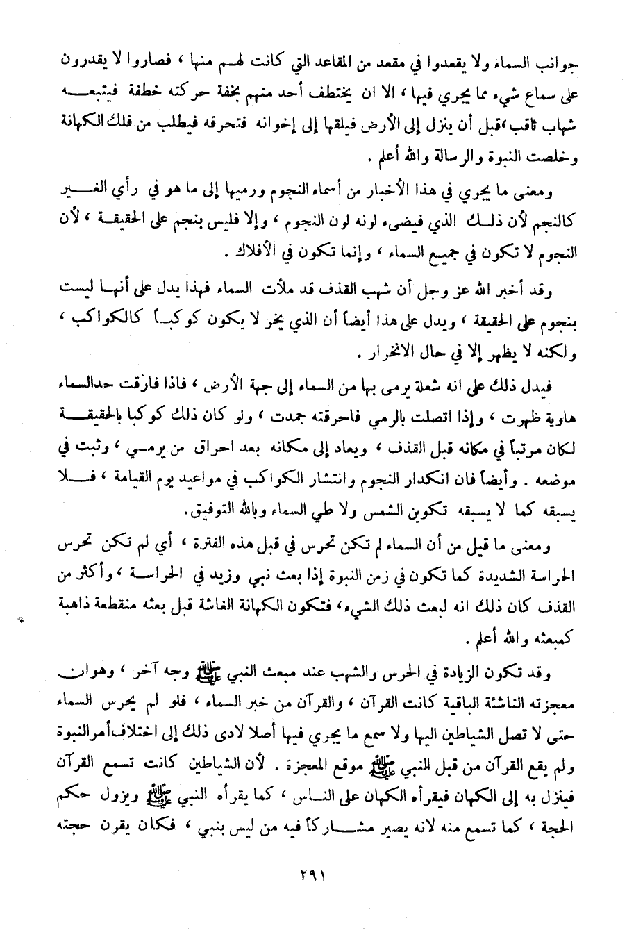 ومعنى ما قيل من أن السماء لم تكن تحرس في قبل هذه الفترة، أي لم تكن تحرس الحراسة الشديدة كما تكون في زمن النبوة إذا بعث نبي وزيد في الحراسة، وأكثر من القذف كان ذلك أنه لبعث ذلك الشيء، فتكون الكهانة الفاشة قبل بعثه منقطعة ذاهبة كمبعثه والله أعلم.