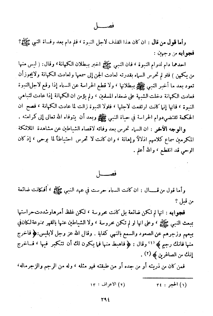 أحدهما دام لدوام النبوة، فإن النبي صلى الله عليه وسلم أخبر ببطلان الكهانة، وقال: (ليس منها من يكهن) فلو لم تحرس السماء بقدرته لعادت الجن إلى سمعها ولعادت الكهانة ولا يجوز أن تعود بعد ما أخبر النبي صلى الله عليه وسلم ببطلانها، ولا قطع الحراسة عن السماء إذا وقع لأجل النبوة فعادت الكهانة دخلت الشبهة على ضعفاء المسلمين، ولم يؤمن أن الكهانة إذا عادت لتباهي النبوة، فإنها إنما كانت ارتفعت لأجلها، فلولا النبوة زالت لما عادت الكهانة، فصح أن الحكمة تقتضي دوام الحراسة في حياة النبي صلى الله عليه وسلم وبعد أنه يتوفاه الله تعالى إلى كرامته.