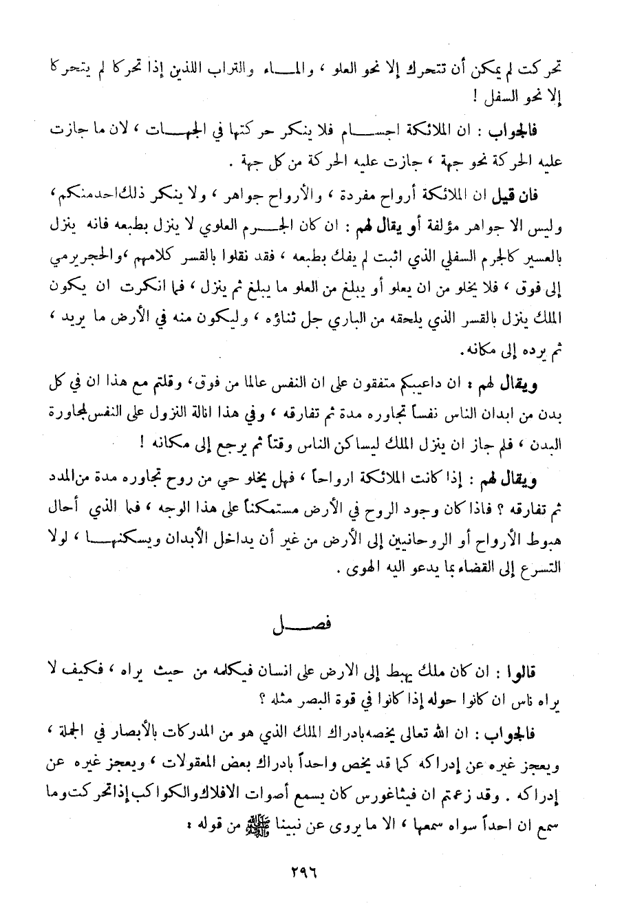 فإن قيل أن الملائكة روح مفردة، والأرواح جواهر، ولا ينكر ذلك أحد منكم، وليس إلا جواهر مؤلفة أو يقال لهم: أن كل الجرم العلوي لا ينزل بطبعه فإنه ينزل بالعسير كالجرم السفلي الذي اثبت لم يفك بطبعه، فقد نقلوا بالقسر كلامهم، والحجر يرمى إلى فوق، فلا يخلو من أن يعلو أو يبلغ من العلو ما يبلغ ثم ينزل، فما أنكرت أن يكونه الملك ينزل بالقسر الذي يلحق من الباري جل ثناؤه، وليكون منه في الأرض ما يريد، ثم يرده إلى مكانه.