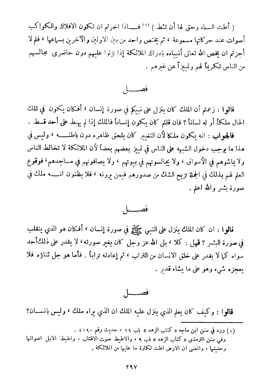 قالوا: زعمتم أن الملك كان ينزل على نبيكم في صورة إنسان، أفكان يكون في تلك الحال ملكاً أو له لساناً؟ فإن قلتم كان يكون إنساناً فالملك إذا لم يهبط على أحد قط.