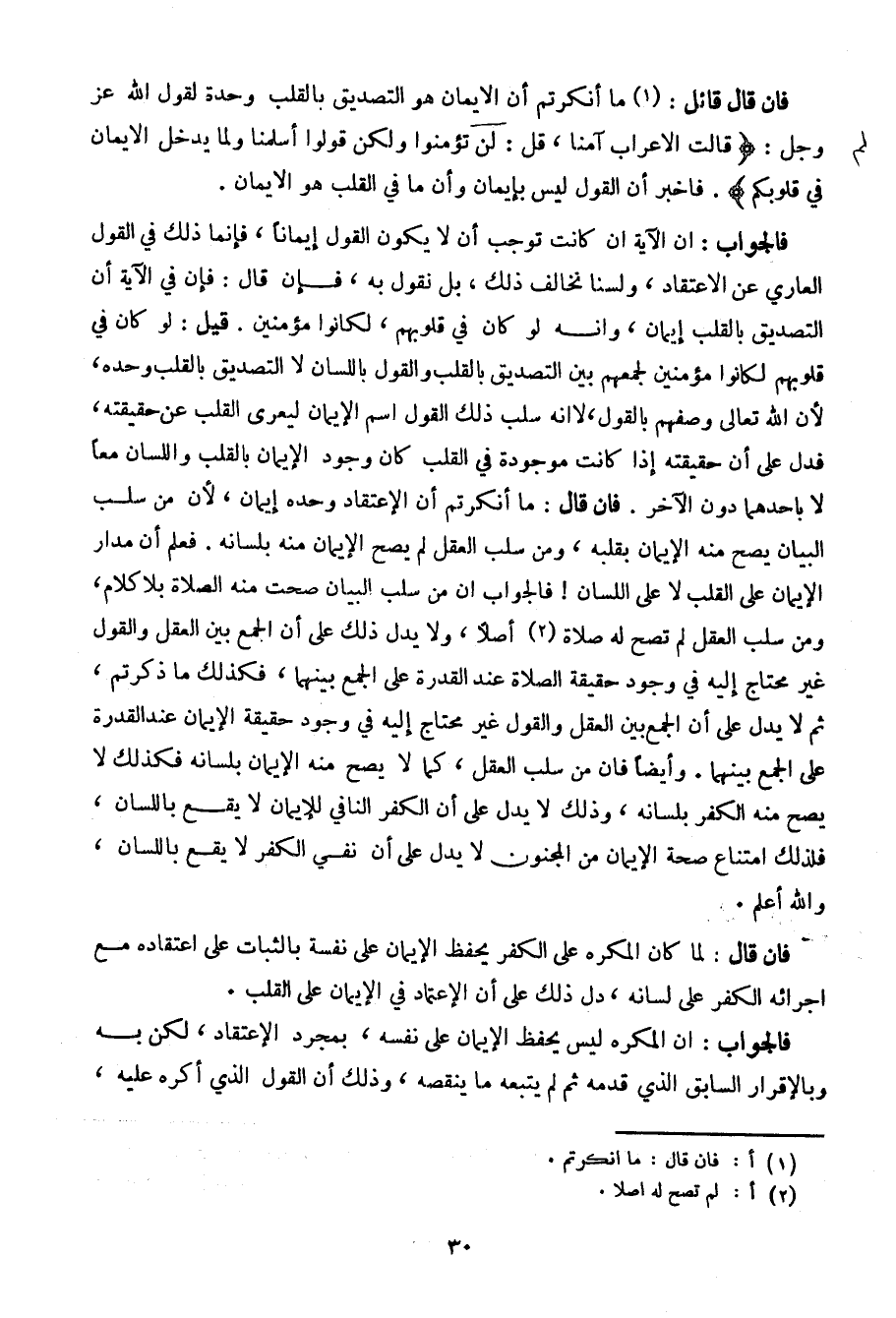 فالجواب: أن الآية إن كانت توجب أن لا يكون القول إيمانا، فإنما ذلك في القول العاري عن الاعتقاد، ولسنا نخالف ذلك، بل نقول به، فإن قال: فإن في الآية أن التصديق بالقلب إيمان، وإنه لو كان في قلوبهم، لكانوا مؤمنين. قيل: لو كان في قلوبهم لكانوا مؤمنين لجمعهم بين التصديق بالقلب والقول باللسان لا التصديق بالقلب وحده، لأن الله تعالى وصفهم بالقول، لا إنه سلب ذلك القول اسم الإيمان ليعري القلب عن حقيقته، فدل على أن حقيقته إذا كانت موجودة في القلب كان وجود الإيمان بالقلب واللسان معا لا بأحدهما دون الآخر. فإن قال: ما أنكرتم أن الاعتقاد وحده إيمان، لأن من سلب البيان يصح منه الإيمان بقلبه، ومن سلب العقل لم يصح الإيمان منه بلسانه. فعلم أن مدار الإيمان على القلب لا على اللسان! فالجواب أن من سلب البيان صحت منه الصلاة بلا كلام، ومن سلب العقل لم تصح له صلاة أصلا، ولا يدل ذلك على أن الجمع بين العقل والقول غير محتاج إليه في وجود حقيقة الصلاة عند القدرة على الجمع بينهما، فكذلك ما ذكرتم، ثم لا يدل على أن الجمع بين العقل والقول غير محتاج إليه في وجود حقيقة الإيمان عند القدرة على الجمع بينهما. وأيضا فإن من سلب العقل، كما لا يصح منه الإيمان بلسانه فكذلك لا يصح منه الكفر بلسانه، وذلك لا يدل على أن الكفر النافي للإيمان لا يقع باللسان، فلذلك امتناع صحة الإيمان من المجنون لا يدل على أن نفي الكفر لا يقع باللسان, والله أعلم.