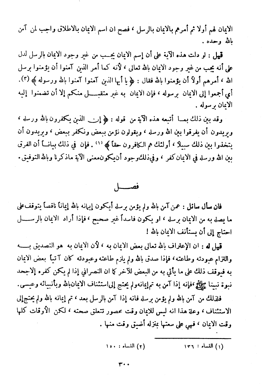 فإن سأل سائل: عمن آمن بالله ولم يؤمن برسله أن يكون إيمانه بالله إيماناً ناقصاً يتوقف على ما يصله به من الإيمان برسله، أو يكون فاسداً غير صحيح، فإذا أراد الإيمان بالرسل احتاج إلى أن يستأنف الإيمان بالله!