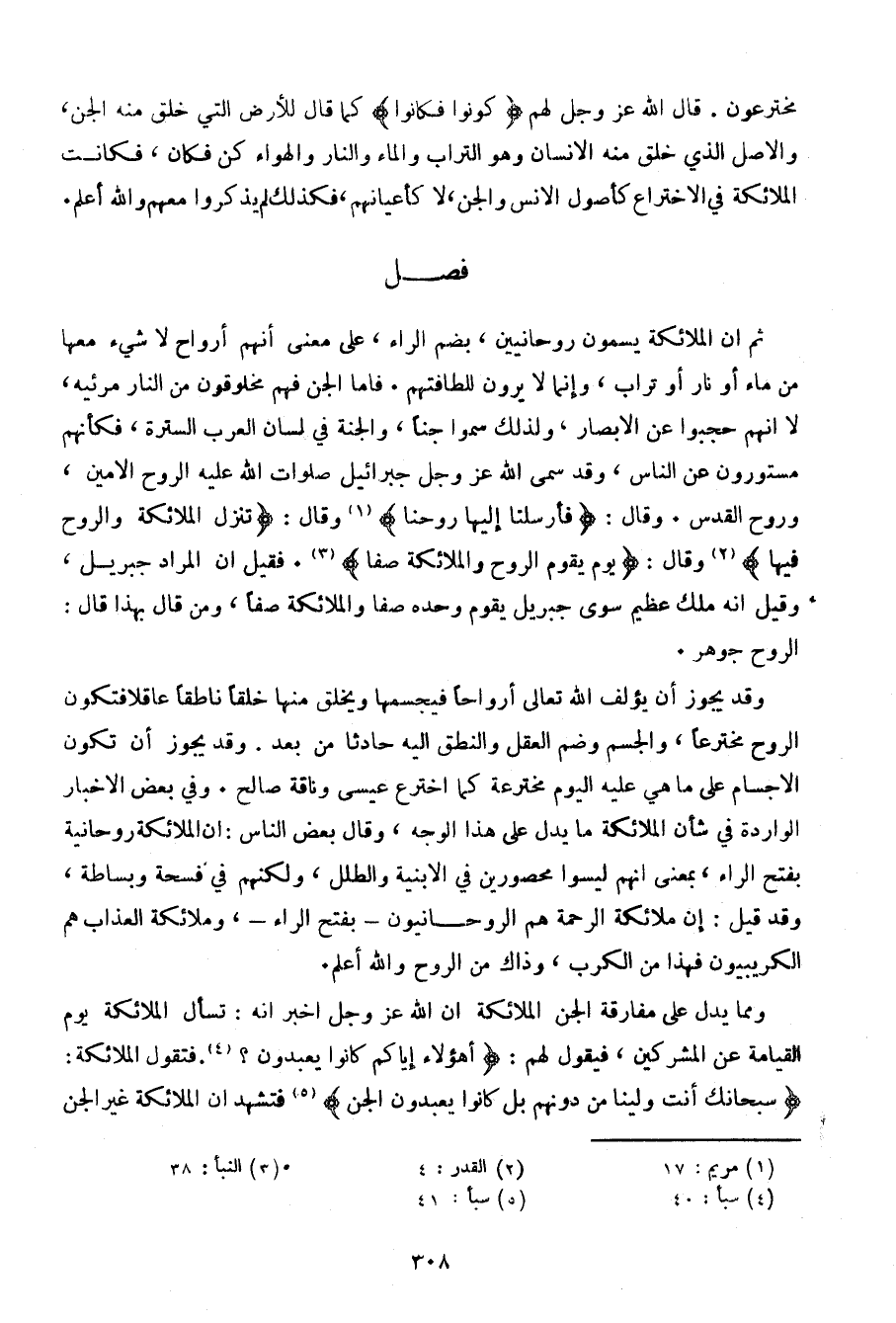 ثم أن الملائكة يسمون روحانيين، بضم الراء، على معنى أنهم أرواح لا شيء معها من ماء أو نار أو تراب، وإنما لا يرون للطافتهم، فأما الجن فهم مخلوقون من النار مرئية، لا أنهم حجبوا عن الأبصار، ولذلك سموا جناً، والجنة في لسان العرب السترة، فكأنهم مستورون عن الناس، وقد سمى الله عز وجل جبرائيل صلوات الله عليه الروح الأمين، وروح القدس. وقال: {فأرسلنا إليها روحنا} وقال: {تنزل الملائكة والروح فيها} وقال: {يوم يقوم الروح والملائكة صفا}. فقيل إن المراد جبريل، وقيل أنه ملك عظيم سوى جبريل يقوم وحده صفا والملائكة صفا، ومن قال بهذا قال: الروح جوهر.