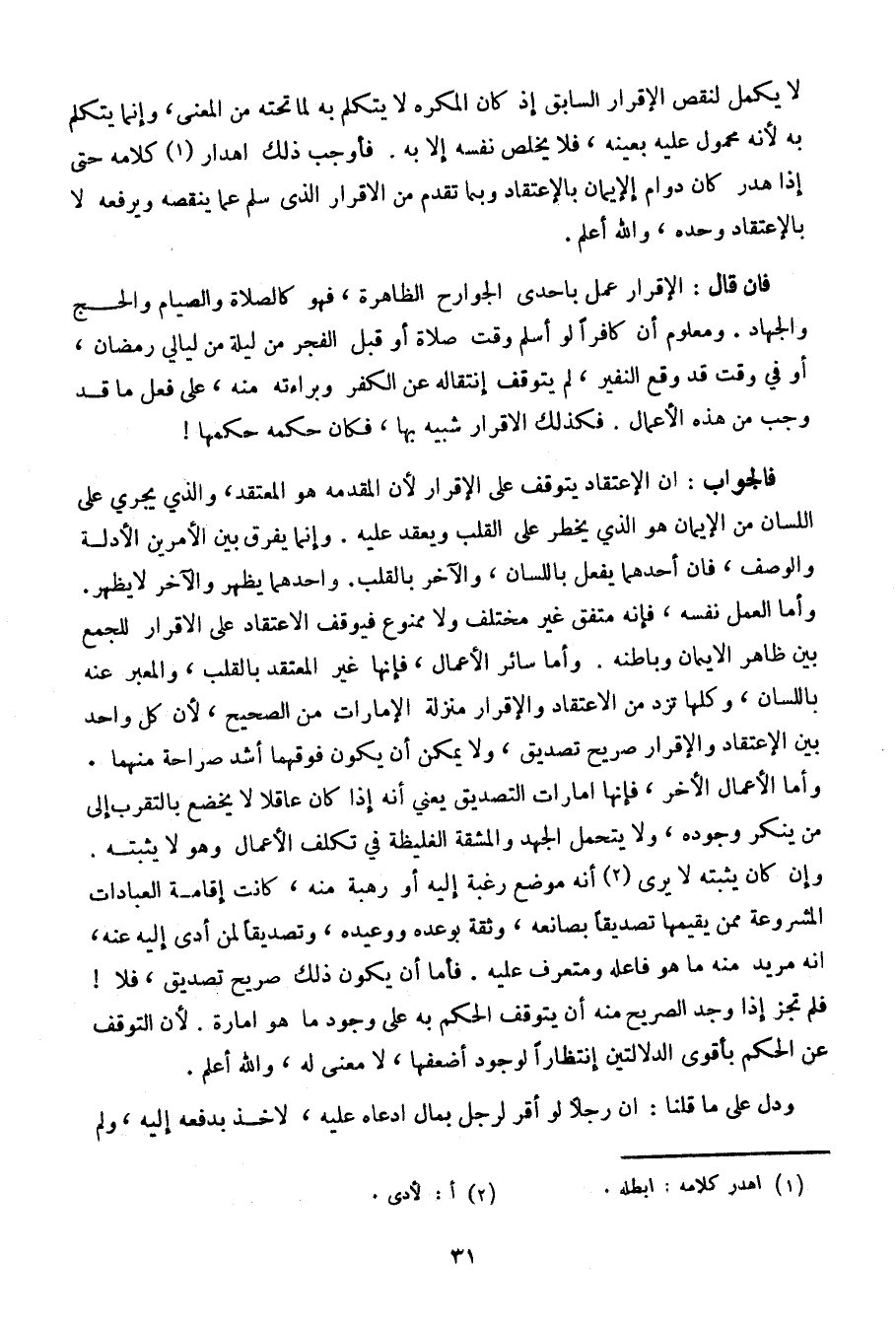 فالجواب: أن الاعتقاد يتوقف عن الإقرار لأن المقدمة هو المعتقد، والذي يجري على اللسان من الإيمان هو الذي يخطر على القلب ويعقد عليه. وإنما يفرق بين الأمرين الأدلة والوصف، فإن أحدهما يفعل باللسان، والآخر بالقلب، وأحدهما يظهر والآخر لا يظهر. وأما العمل نفسه، فإنه متفق غير مختلف ولا ممنوع فيوقف الاعتقاد على الإقرار للجمع بين ظاهر الإيمان وباطنه. وأما سائر الأعمال، فإنها غير المعتقد بالقلب، والمعبر عنه باللسان، وكلها تزد من الاعتقاد والإقرار منزلة الإمارات من الصحيح، لأن كل واحد بين الاعتقاد والإقرار صريح تصديق، ولا يمكن أن يكون فوقهما أشد صراحة منهما. وأما الأعمال الأخر، فإنها أمارات التصديق يعني أنه إذا كان عاقلا لا يخضع بالتقرب إلى من ينكر وجوده، ولا يتحمل الجهد والمشقة الغليظة في تكلف الأعمال وهو لا يثبته. وإن كان يثبته لا يرى أنه موضع رغبة إليه أو رهبة منه، كانت إقامة العبادات المشروعة ممن يقيمها تصديقا بصانعه، وثقة بوعيده ووعيده، وتصديقا لمن أدى إليه عنه، أنه مريد منه ما هو فاعله ومتعرف عليه. فأما أن يكون ذلك صريح تصديق، فلا! فلم تجز إذا وجد الصريح منه أن يتوقف الحكم به على وجود ما هو أمارة. لأن التوقف على الحكم بأقوى الدلالتين انتظارا لوجود أضعفها، لا معنى له، والله أعلم.