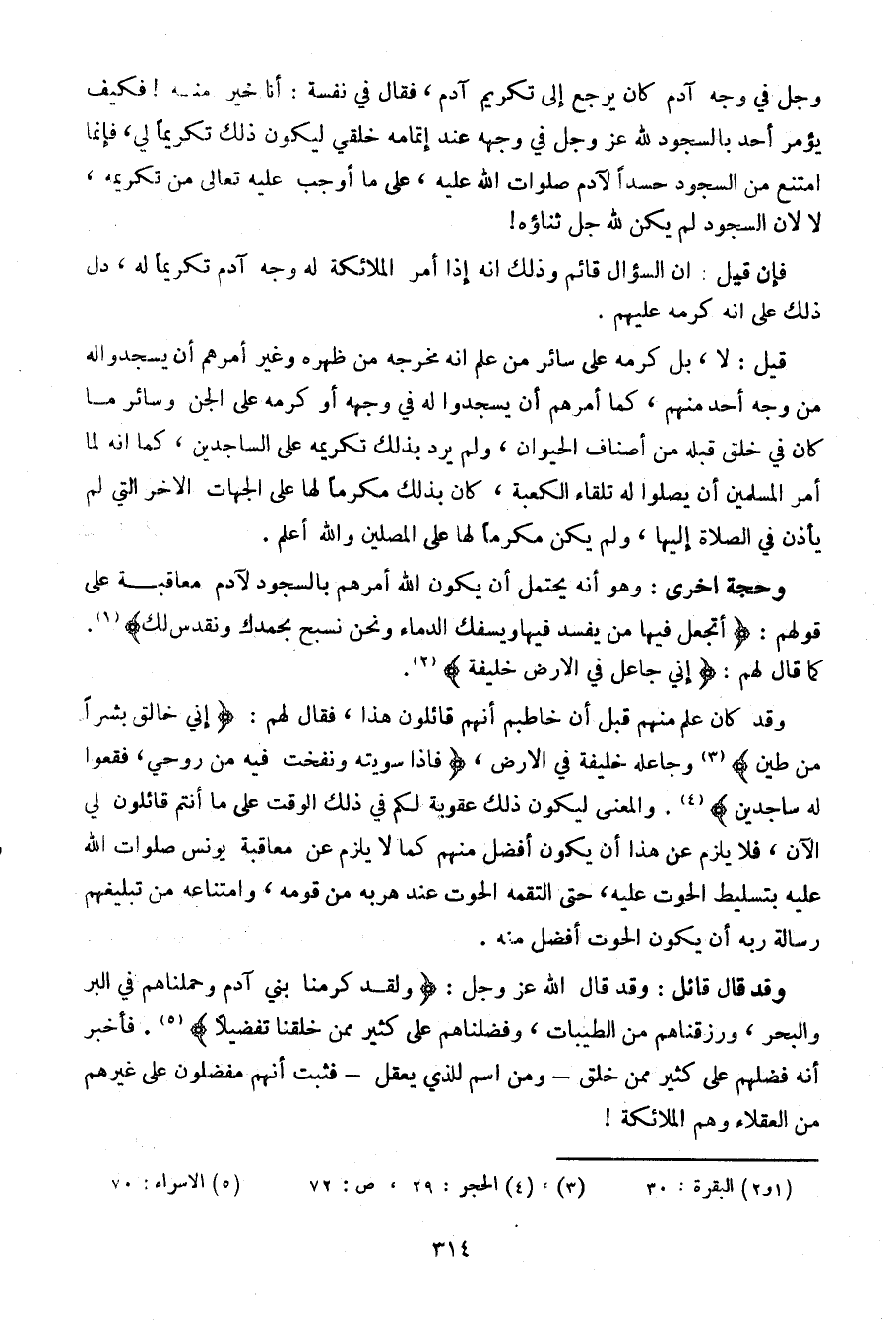 وقد كان علم منهم قبل أن خاطبهم أنهم قائلون هذا، فقال لهم: {إني خالق بشراً من طينس} وجاعله خليفة في الأرض، {فإذا سويته ونفخت فيه من روحي، فقعوا له ساجدينه}. والمعنى ليكون ذلك عقوبة لكم في ذلك عقوبة لكم في ذلك الوقت على ما أنتم قائلون لي الآن، فلا يلزم عن هذا أن يكون أفضل منهم كما لا يلزم عن معاقبة يونس صلوات الله عليه بتسليط الحوت عليه، حتى التقمه الحوت عند هربه من قومه، وامتناعه من تبليغهم رسالة ربه أن يكون الحوت أفضل منه.