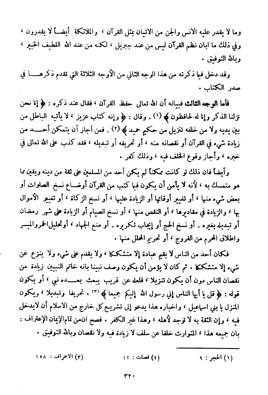 فأما الوجه الثالث فبيانه أنه الله تعالى حفظ القرآن، فقال عند ذكره: {إنا نحن نزلنا الذكر وإنا له لحافظون}. وقال: {وإنه كتاب عزيز، لا يأتيه الباطل من بين يديه ولا من خلقه تنزيل من حكيم حميد}. فمن أجاز أن يتمكن أحد من زيادة شيء في القرآن أو نقصانه منه، أو تحريفه أو تبديله، فقد كذب على الله تعالى فيث خبره، وأجاز وقوع الخف فيه، وذلك كفر.