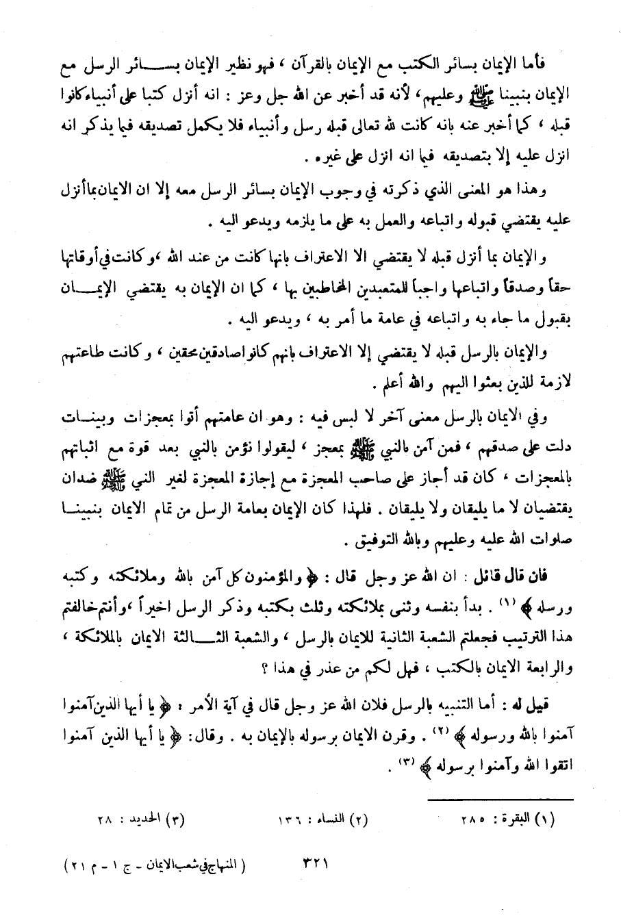 فأما الإيمان بسائر الكتب مع الإيمان بالقرآن، فهو نظير الإيمان بسائر الرسل مع الإيمان بنبينا صلى الله عليه وسلم وعليهم، لأنه قد أخبر عنه الله عز وجل: أنه أنزل كتبا على أنبياء كانوا قبله، كما أخبر عنه بأنه كانت لله تعالى قبله رسل وأنبياء فلا يكمل تصديقه فيما يذكر أنه أنزل عليه إلا بتصديقه عليه إلا بتصديقه فيما أنزل على غيره.