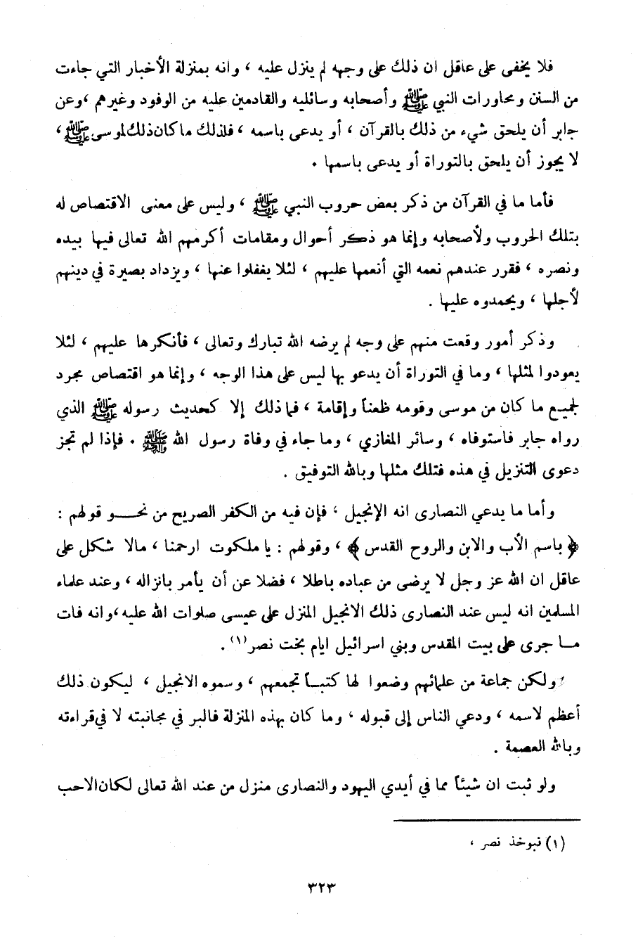 وأما ما يدعى النصارى أنه الإنجيل، فإن فيه من الكفر الصريح من نحو قولهم: {باسم الأب والإبن والروح القدس}، وقولهم: يا ملكوت الرحمخن، مالا شكل على عاقل أن الله عز وجل لا يرضى من عباده باطلا، فضلا عن أن يأمر بانزاله، وعند علماء المسلمين أنه ليس عند النصارى ذلك الإنجيل المنزل على عيسى صلوات الله عليه، وأنه فات ما جرى على بيت المقدس وبني إٍسرائيل أيام بخت نصر.