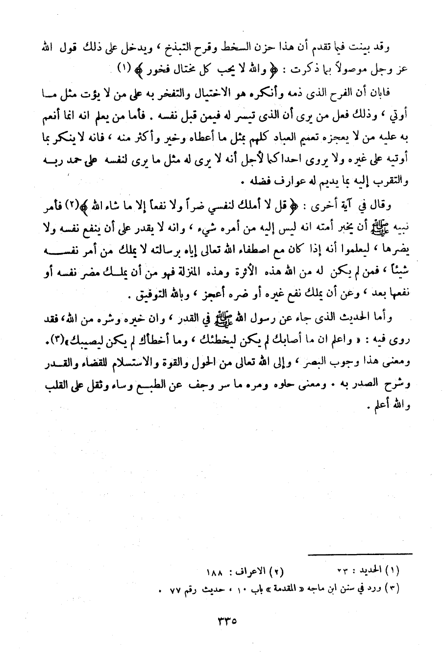وأما الحديث الذي جاء عن رسول الله صلى الله عليه وسلم في القدر، وإن خيره وشره من الله، فقد روى فيه: (وأعلم أن ما أصابكم لم يكن ليخطئك، وما أخطأك لم يكن يصيبك). ومعنى هذا وجوب البصر، وإلى الله تعالى من الحول والقوة والاستسلام للقضاء والقدر وشرح الصدر به. ومعنى حلوه ومره ما سر وجف عن الطبع وساء وثقل على القلب والله أعلم.