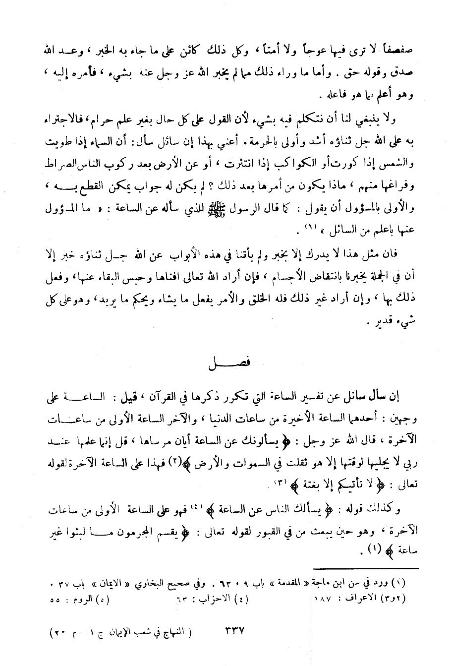 ولا ينبغي لنا أن نتكلم فيه بشيء لأن القول على كل حال يغير علم حرام، فالاجتراء به على الله جل ثناؤه أشد وأولى بالحرمة. أغني بهذا إن سائل سأل: أن السماء إذا طويت والشمس إذا كورت أو الكواكب إذا انتثرت، أو عن الأرض بعد ركوب الناس الصراط وفراغها منهم، ماذا يكون من أمرها بعد ذلك؟ لم يكن له جواب يمكن القطع به، والأولى بالمسؤول أن يقول: كما قال الرسول صلى الله عليه وسلم للذي سأله عن الساعة: (ما المسؤول عنها بأعلم من السائل).