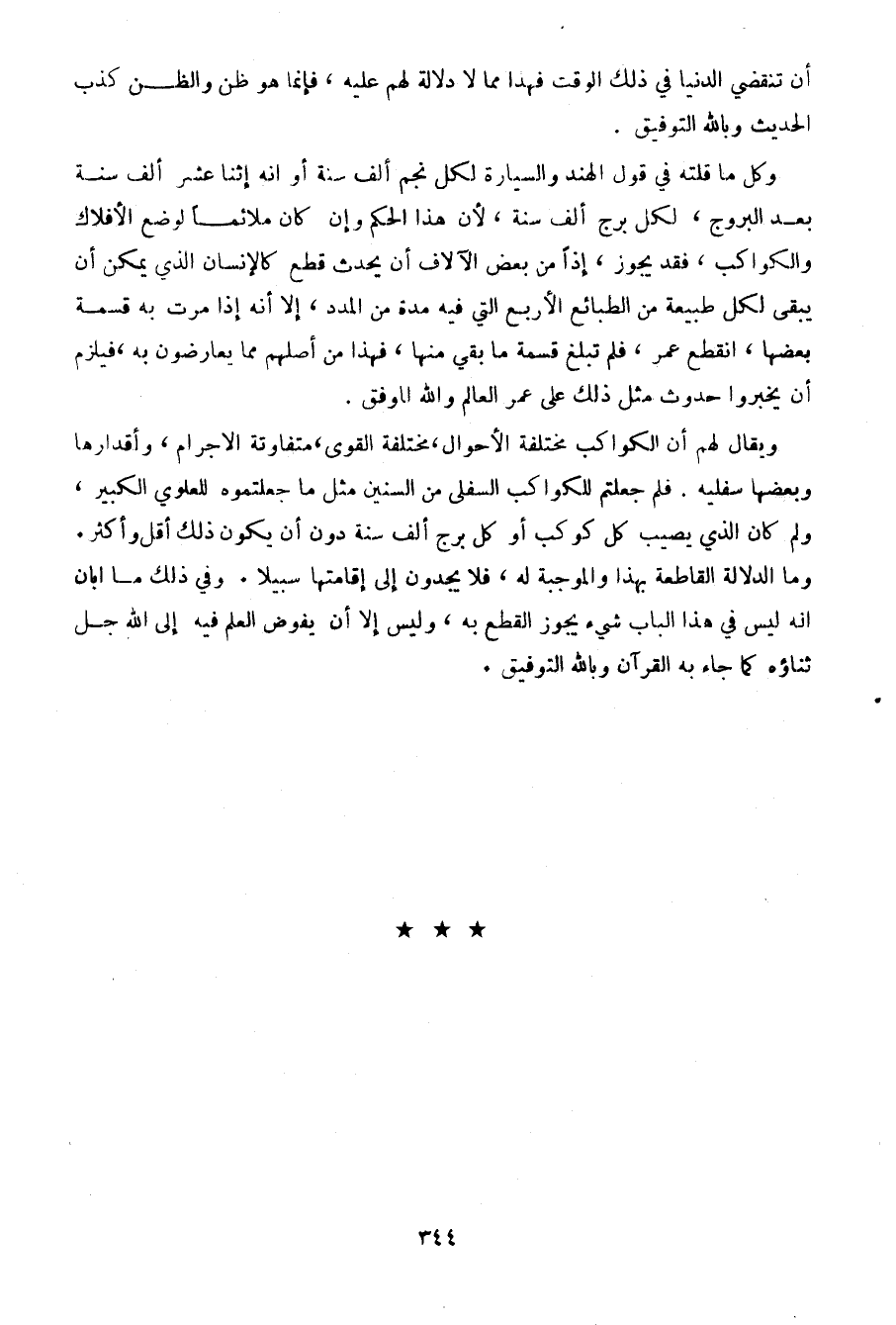 ويقال لهم أن الكواكب مختلفة الأحوال، مختلفة القوى، متفاوتة الأجرام، وأقدارها وبعضها سفلية. فلم جعلتم للكواكب السفلى من السنين مثل ما جعلتموه للعلوي الكبير، ولم كان الذي يصيب كل كوكب أو كل برج ألف سنة دون أن يكون ذلك أقل أو أكثر. ومال الدلالة القاطعة بهذا والموجبة له، فلا يجدون إلى إقامتها سبيلا. وفي ذلك ما أبان أنه ليس في هذا الباب شيء يجوز القطع به، وليس إلا أن يفوض العلم فيه إلى الله جل ثناؤه كما جاء به القرآن وبالله التوفيق.