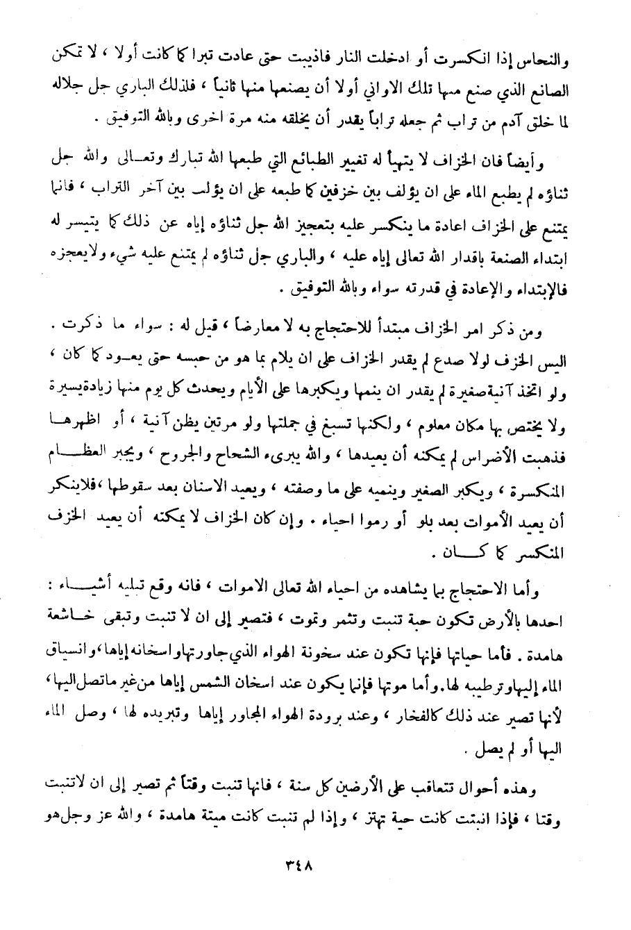 ومن ذكر أمر الخزاف مبتدأ للاحتجاج به لا معارضاً، قيل له سواء ما ذكرت. أليس الخزف لولا صدع الخزاف على أن يلام بما هو من حبسه حتى يعود كما كان، ولو اتخذ آنية صغيره لم يقدر أن ينمها ويكبرها على الأيام ويحدث كل يوم منها زيادة يسيرة ولا يختص بها مكان معلوم، ولكنها تسبغ في جملتها ولو مرتين يظن آنية، أو أظهرها فذهبت الأضراس لم يكنه أن يعيدها، والله يبري الشحاح والجروح، ويجبر العظام المنكسرة، ويكبر الصغير وينميه على ما وصفته، ويعيد الأسنان بعد سقوطها، فلا ينكر أن يعيد الأموات بعد بلو أو رموا أحياء. وإن كان الخزاف لا يمكنه أن يعيد الخزف المنكسر كما كان.
