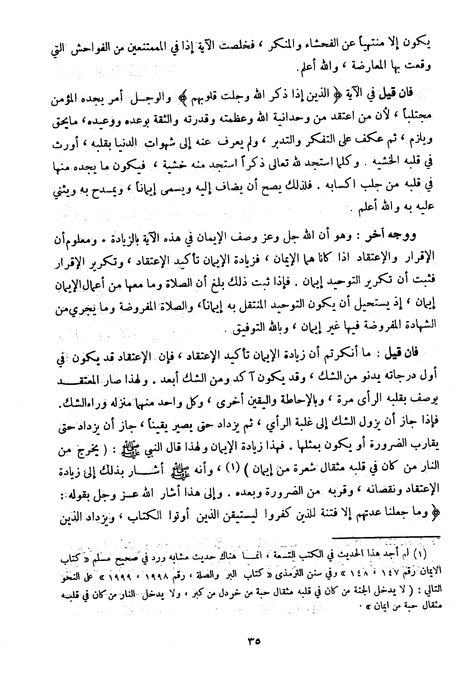 فإن قيل: ما أنكرتم أن زيادة الإيمان تأكيد الاعتقاد، فإن الاعتقاد قد يكون في أول درجاته يدنو من الشك، وقد يكون آكد ومن الشك أبعد. ولهذا صار المعتقد يوصف بقلبه الرأي مرة، وبالإحاطة واليقين أخرى، وكل واحد منهما منزله وراء الشك. فإذا جاز أن يزول الشك إلى غلبة الرأي، ثم يزداد حتى يكون يقينا، جاز أن يزداد حتى يقارب الضرورة أو يكون بمثلها. فهذا زيادة الإيمان ولهذا قال النبي صلى الله عليه وسلم: (يخرج من النار من كان في قلبه مثقال شعرة من إيمان)، وأنه صلى الله عليه وسلم أشار بذلك إلى زيادة الاعتقاد ونقصانه، وقربه من الضرورة وبعده. وإلى هذا أشار الله عز وجل بقوله: {وما جعلنا عدتهم إلا فتنة للذين كفروا ليستيقن الذين أوتوا الكتاب، ويزداد الذين