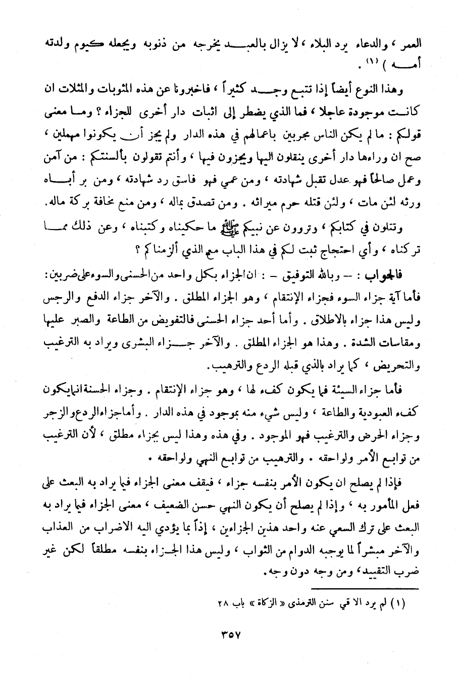 فأما جزا السيئة فما يكون كفء لها، وهو جزاء الانتقام. وجزاء الحسنة إنما يكون كفء العبودية والطاعة، وليس شيء منه بموجود في هذه الدار. وأما جزاء الردع والزجر وجزاء الحرض والترغيب فهو الموجود. وفي هذه وهذا ليس بجزاء مطلق، لأن الترغيب من توابع الأمر ولواحقه. والترهيب من توابع النهي ولواحقه.