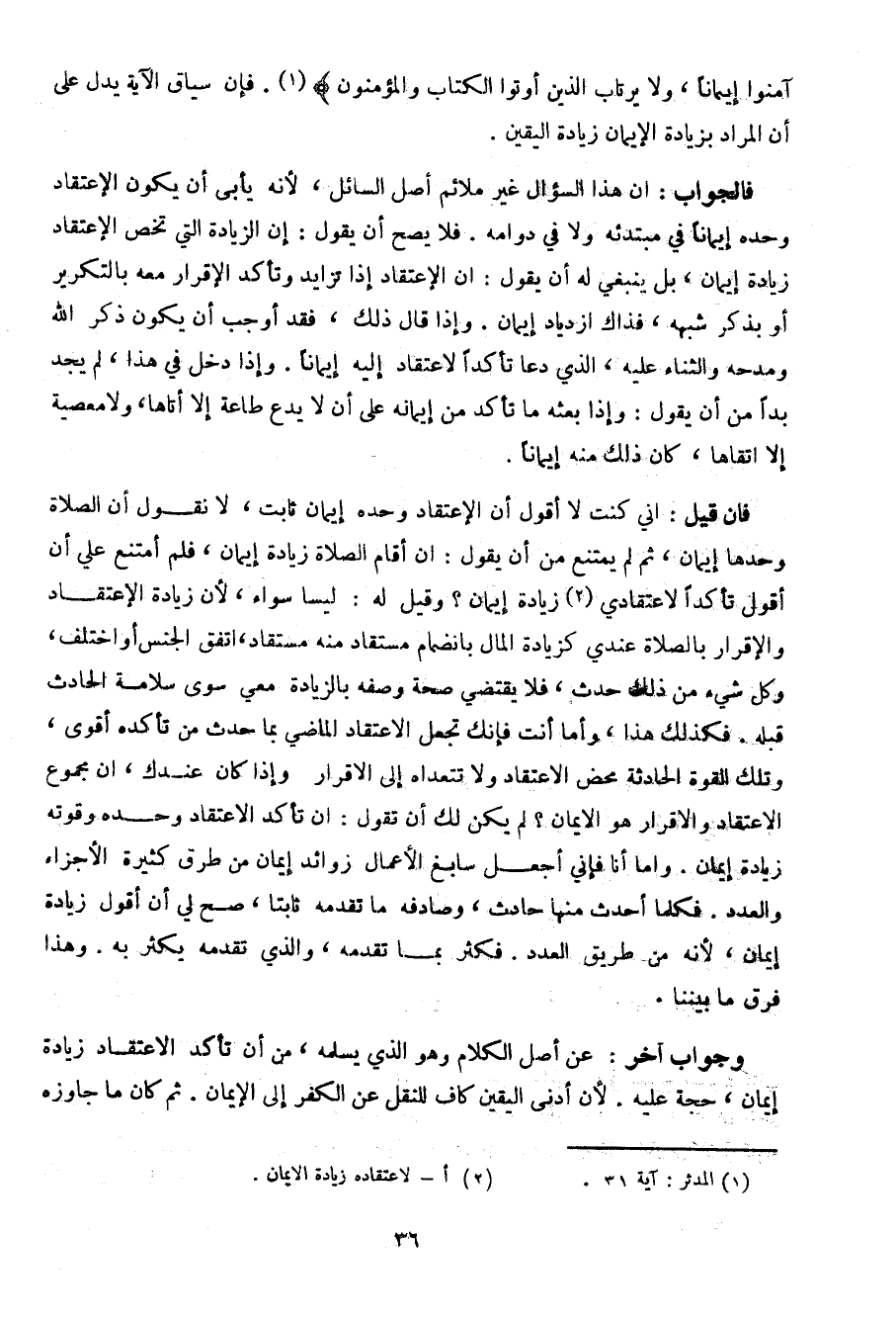 وجواب آخر: عن أصل الكلام وهو الذي يسلمه، من أن تأكد الاعتقاد زيادة إيمان، حجة عليه. لأن أدنى اليقين كاف للنقل عن الكفر إلى الإيمان. ثم كان ما جاوزه