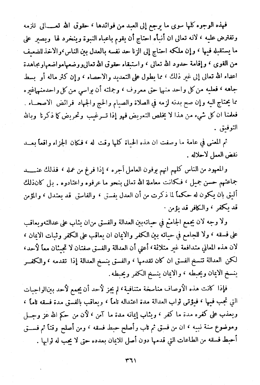 ولا وجه لأن يجمع الجامع في حياته بين العدالة والفسق من أن يثاب على عدالته ويعاقب على فسقه، ولا للجامع في حياته بين الكفر والإيمان أن يعاقب على الكفر وثبات الإيمان، لأن هذه المعاني متدافعة غير متلائمة، أعني أن العدالة والفسق صفتان لا تجيئان معا لأحد، لكن العدالة تنسخ الفسق إن كان تقدمها، والفسق ينسخ العدالة إذا تقدمه، والكفر ينسخ الإيمان ويحيطه، والإيمان بنسخ الكفر ويحيطه.