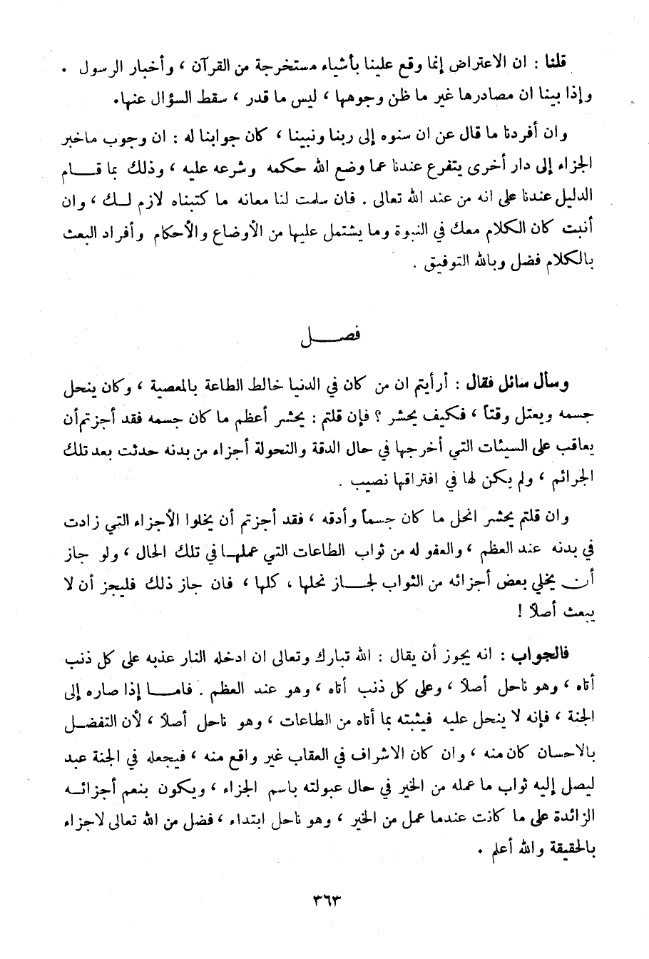 وإن أفردنا ما قال عن أن سنوه إلى ربنا ونبينا، وكان جوابنا له: إن وجوب ما خبر الجزاء إلى دار أخرى يتفرع عندنا عما وضع الله حكمه وشرعه عليه، وذلك بما قام الدليل عندنا على أنه من عند الله تعالى. فإن سلمت لنا معانه ما كتبناه لازم لك، وإن أنبت كان الكلام معك في النبوة وما يشتمل عليها من الأوضاع والأحكام وأفراد البعث بالكلام فضل وبالله التوفيق.