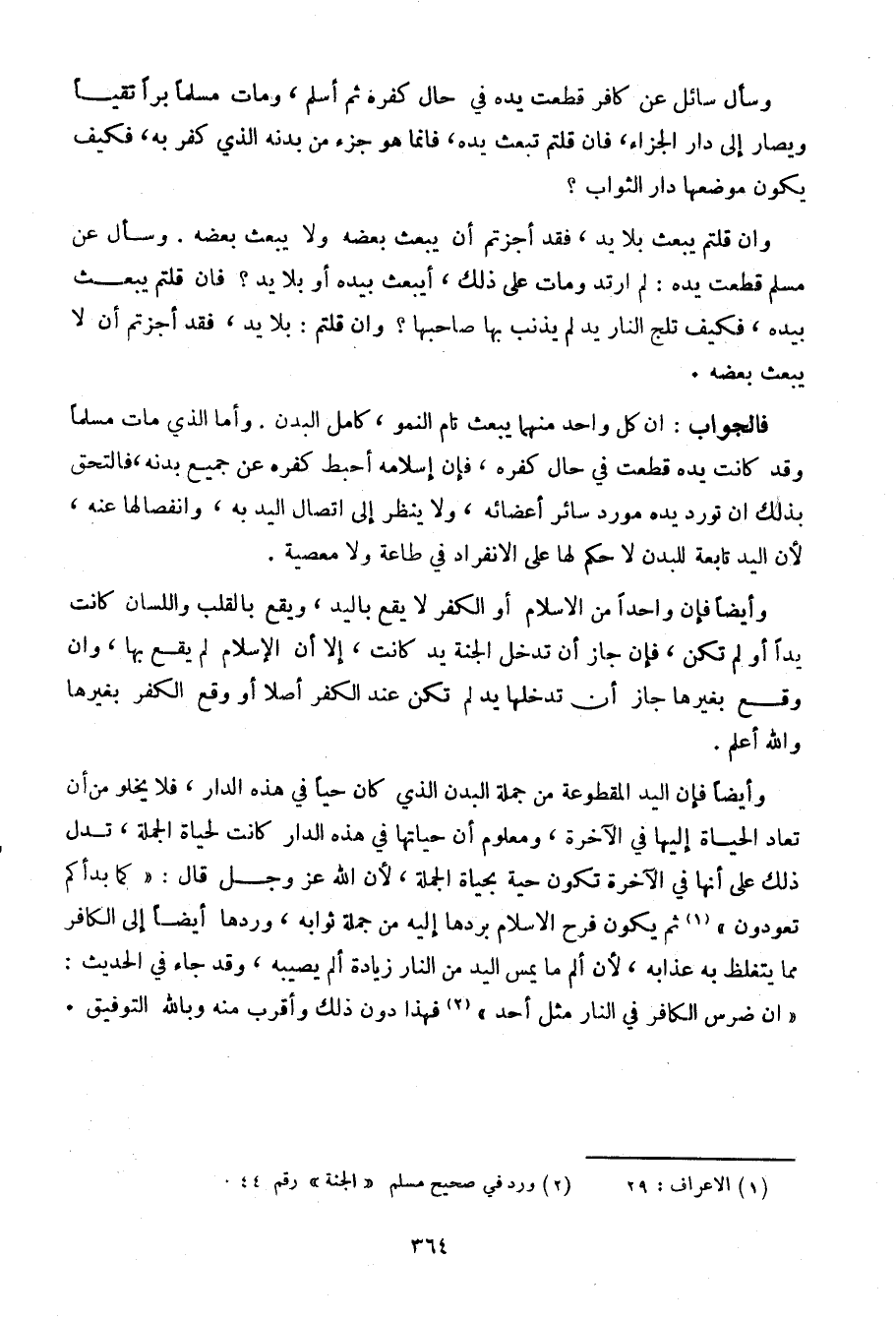 فالجواب: أن كل واحد منهما يبعث تام النمو، كامل البدن. وأما الذي مات مسلما وقد كانت يده قطعت في حال كفره، فإن إسلامه أحبط كفره عن جميع بدنه، فالتحق بذلك أن تورد يده مورد سائر أعضائه، ولا ينظر إلى اتصال اليد به، وانفصالها عنه، لأن اليد تابعة للبدن لا حكم لها على الانفراد في طاعة ولا معصية.