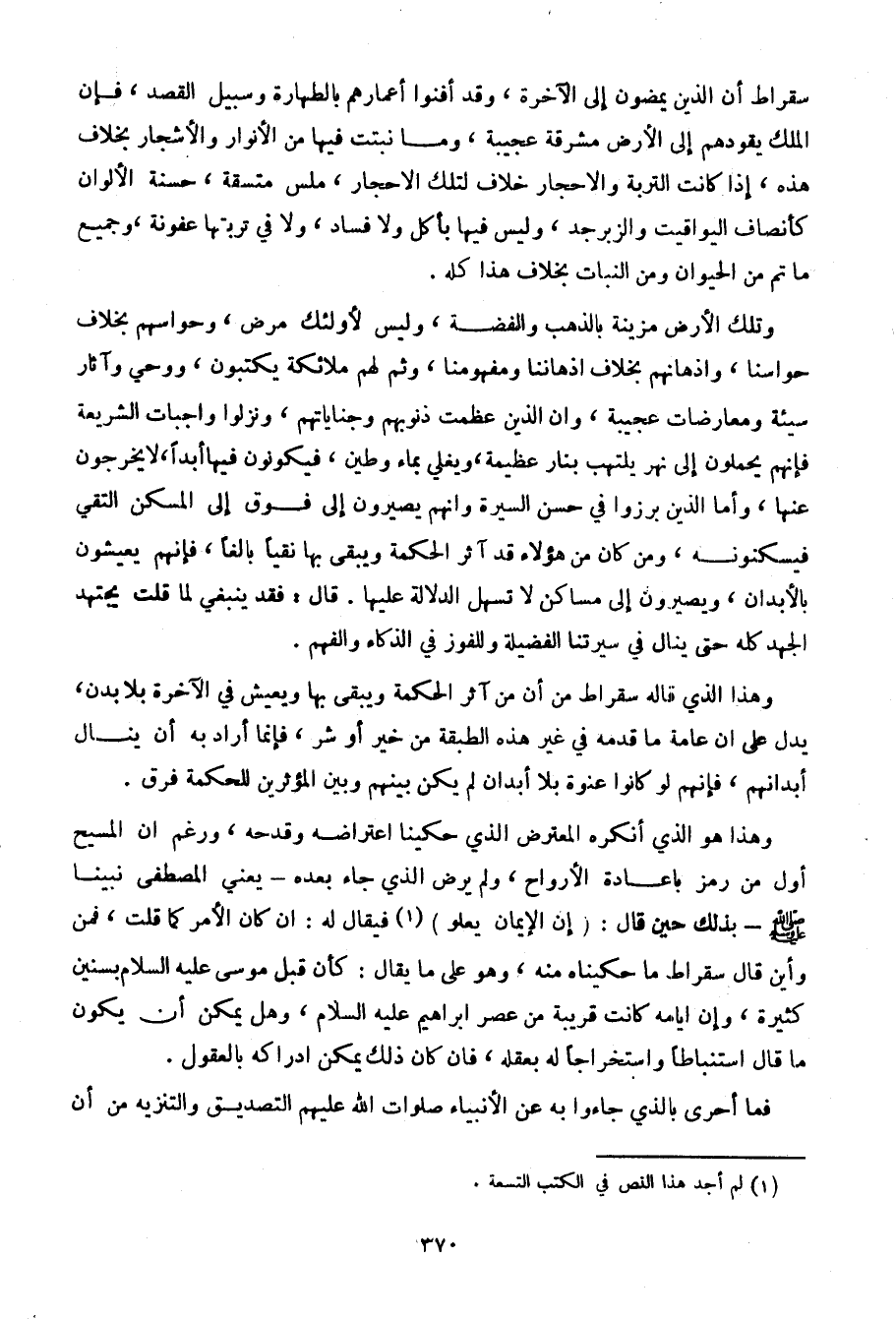 وهذا هو الذي أنكره المعترض الذي حكينا اعتراضه وقدحه، ورغم أن المسيح أول من رزم بإعادة الأرواح، ولم يرض الذي جاء بعده- يعني المصطفى نبينا صلى الله عليه وسلم- بذلك حين قال: (إن الإيمان يعلو) فيقال له: إن كان الأمر كما قلت، فمن وأين قال سقراط ما حكيناه منه، وهو على ما يقال: كأن قبل موسى عليه السلام بسنين كثيرة، وإن أيامه كانت قريبة من عصر إبراهيم عليه السلام، وهل يمكن أن يكون ما قال استنباطا واستخراجا له بعقله، فإن كان ذلك يمكن إدراكه بالعقول.